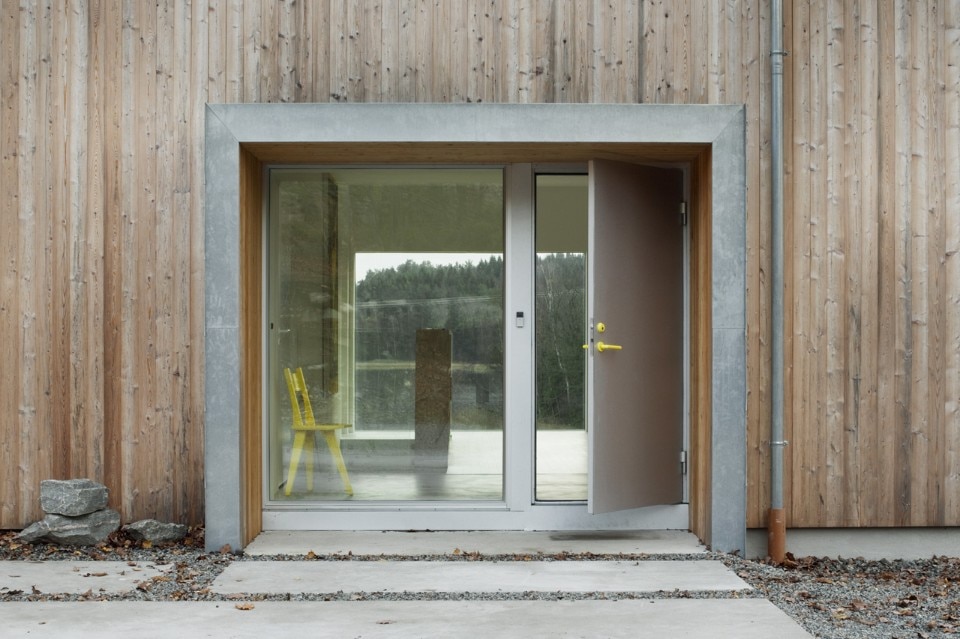 La facciata d’ingresso, chiusa, copre la vista a chi arriva. Avvicinandosi alla casa si intravede il lago attraverso la porta d’ingresso a vetri e si percepisce la Chiesa nella sagoma dell’edificio.