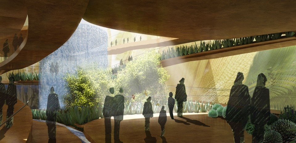 L’idea per la progettazione degli interni del padiglione è stata ispirata dal sistema del bacino del Messico bacino utilizzato durante l’impero idraulico-agrario del re Nezahualcoyotl. In termini di sostenibilità, un sistema del genere è stato un risultato importante, perché lasciare che la gente di quei tempi utilizzava al meglio un ambiente naturale senza deteriorarlo. L’acqua pura delle sorgenti perenni delle alte montagne veniva incanalata iattraverso terrazze e curve di livello, scendendo lentamente attraverso i pendii, irrigando e coprendo vaste estensioni di terra per coltivare una grande varietà di alimenti, infine scorrendo nei laghi.