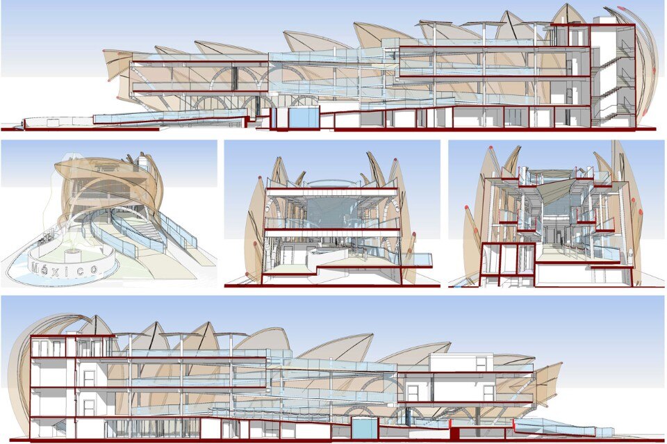 Questo renderà più facile la circolazione per i visitatori disabili. La rampa di salita conduce al tetto. Il ristorante e un giardino urbano si trovano su di esso e da qui si ha una vista della parte interna del padiglione, del sistema di “terrazze espositive”, della cascata e dell’ingresso di luce solare verso la zona centrale verde. Dall’ultimo livello, è possibile accedere alla rampa discendente che conduce al negozio, favorendo la visibilità dei prodotti messicani.