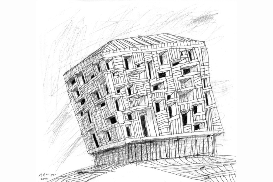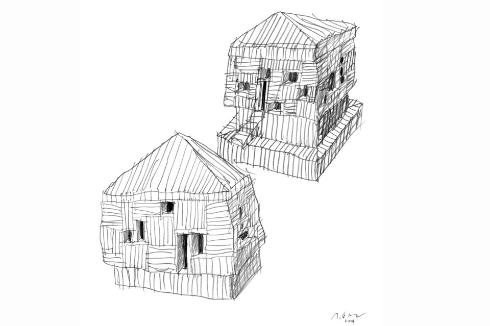 Realizzate nel corso del 2014, le baracche di Michele De Lucchi appaiono come strutture tremolanti e composizioni approssimative dalle geometrie sconquassate, ricche di dettagli.