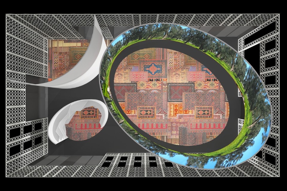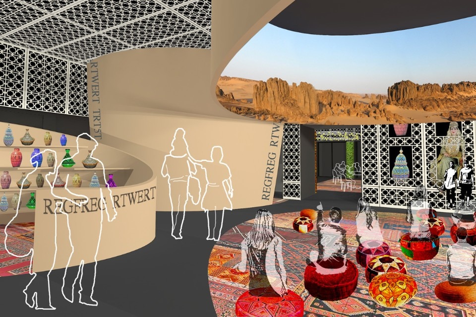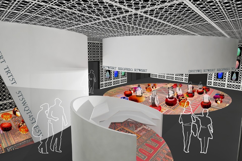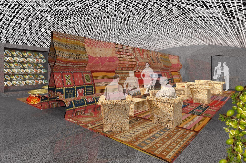 Un lato ospiterà l’accoglienza VIP dove un grande schermo televisivo riproporrà, come in una finestra, le immagini proiettate in contemporanea sullo schermo ellittico al piano terreno, mentre l’altro è destinato alla degustazione di prodotti del territorio e di piatti tipici. Un patchwork di tappeti tipici algerini ricoprirà pavimento e panca centrale e nelle nicchie delle pareti saranno esposti rari oggetti d’arte.