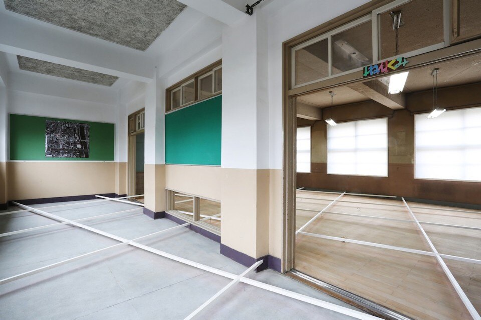 Questo spazio espositivo non è confinato all’interno del perimetro della Scuola Elementare Suujin, ma si estende fino a comprendere le proprietà recintate intorno alla scuola. Le recinzioni verdi sono incorporate all’interno della scuola come un elemento di design che collega i due siti. Anche l’idea di "lucidatura" nello spazio interno è applicata all’esterno creando effetti simili sulla terra con un tosaerba.