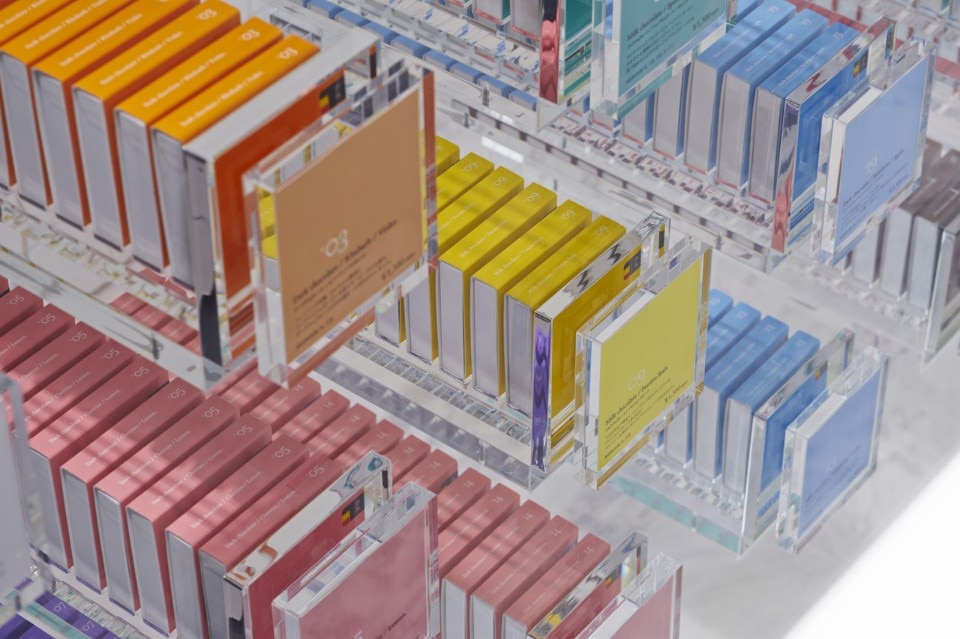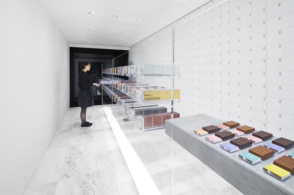 Seguendo questa logica, Nendo ha trasformato lo spazio negozio in una versione tridimensionale della confezione. Il cioccolato sembra galleggiare in un “cassettiera” trasparente, posta al centro del negozio. Quando acquistano i cioccolatini, i clienti scorrono i cassetti e prendono le proprie confezioni, esattamente con lo stesso principio della confezione di cioccolato.