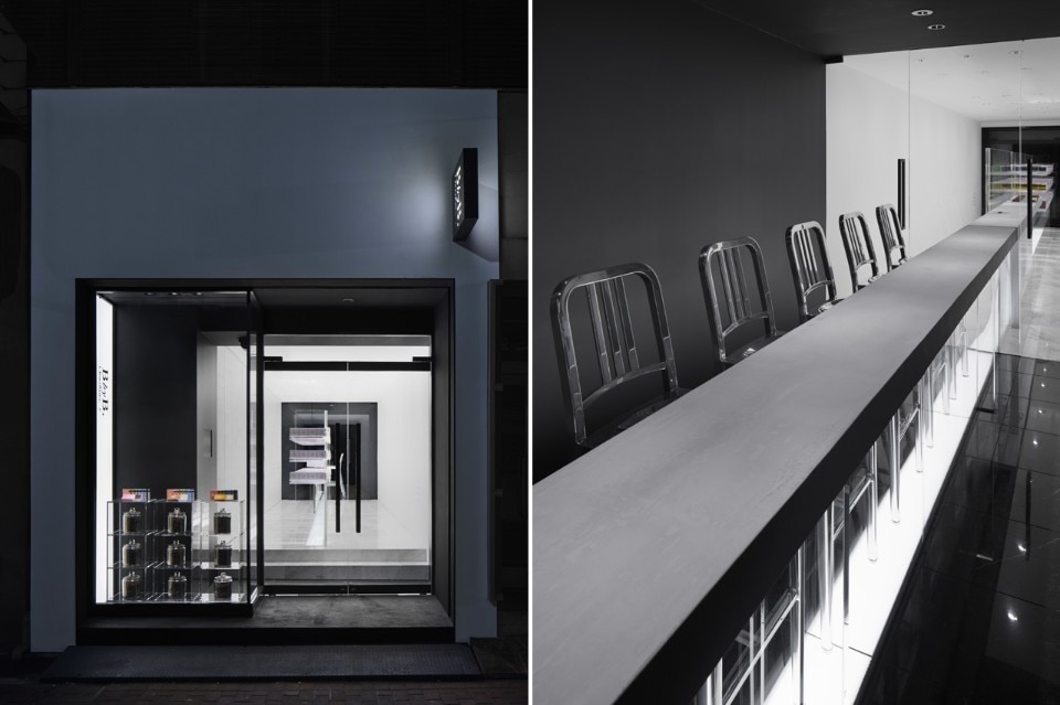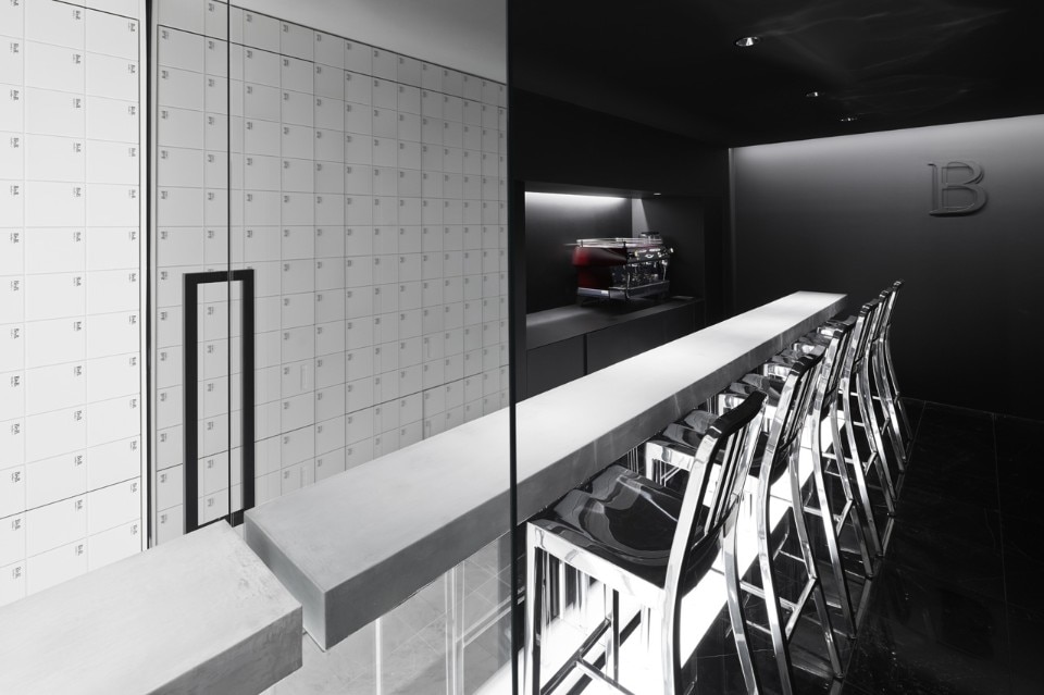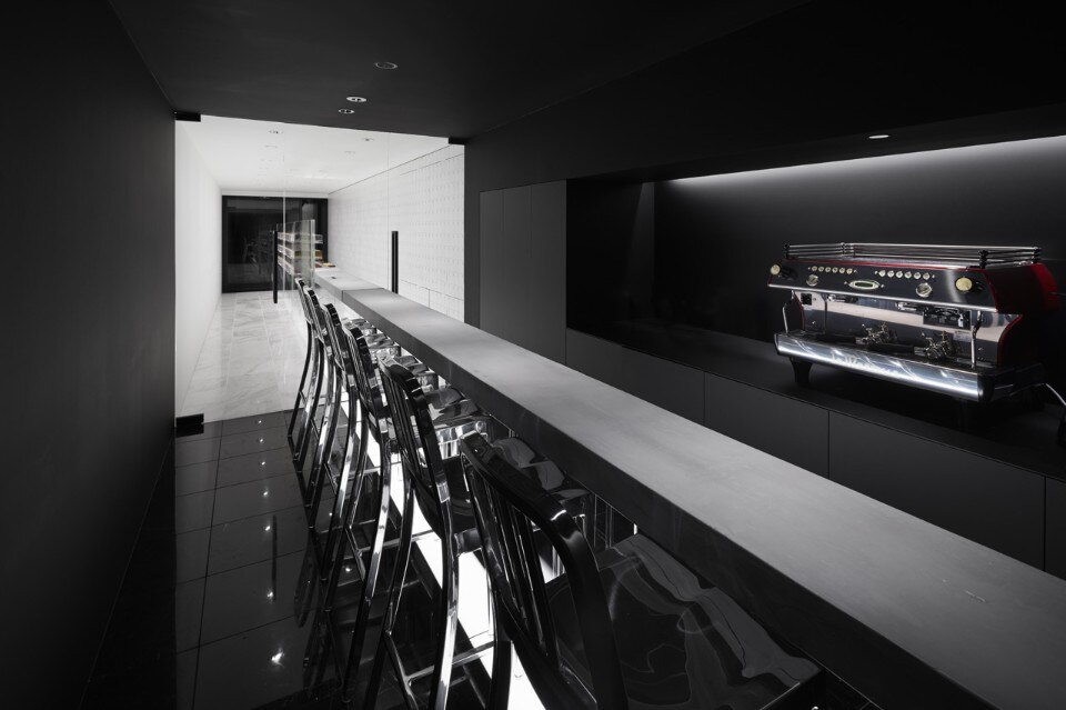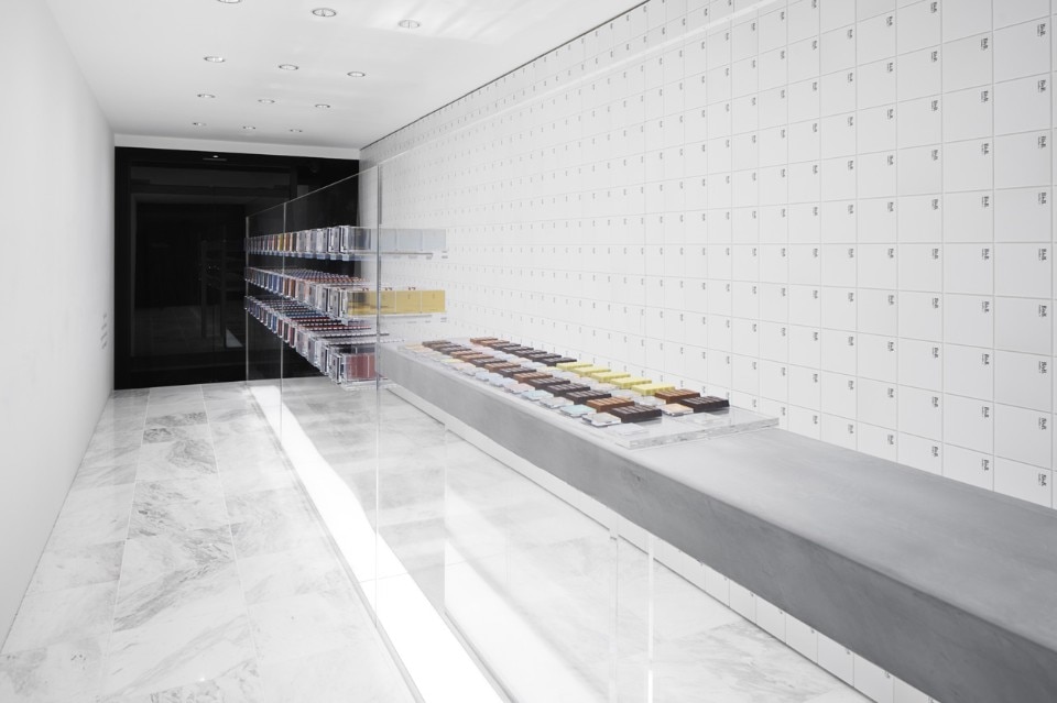 Verso il retro del negozio, la cassettiera trasparente diventa una vetrina che mostra il cioccolato individualmente, poi si trasforma in un bancone per i clienti del bar. Il negozio è uno spazio lungo e stretto, adatto a ospitare un mobile lungo 12,5 m. La parte anteriore del negozio è completamente bianca e il bar completamente nero, seguendo lo schema dei colori del cubo delle confezioni. La parete bianca è “piastrellata” con le confezioni di cioccolato, in modo che diventi essa stessa un “cassetto”. Il design crea una transizione senza soluzione di continuità tra il negozio, la confezione e l’atto di mangiare i cioccolatini, offrendo una esperienza avvincente.