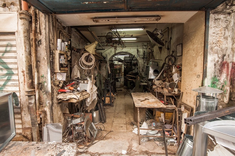 In apertura: Nino Ciminna, uno dei più anziani artigiani di via Calderai a Palermo, al lavoro per realizzare la collezione di lampade 4decimi di Vittorio Venezia. Qui sopra: le botteghe di via Calderai