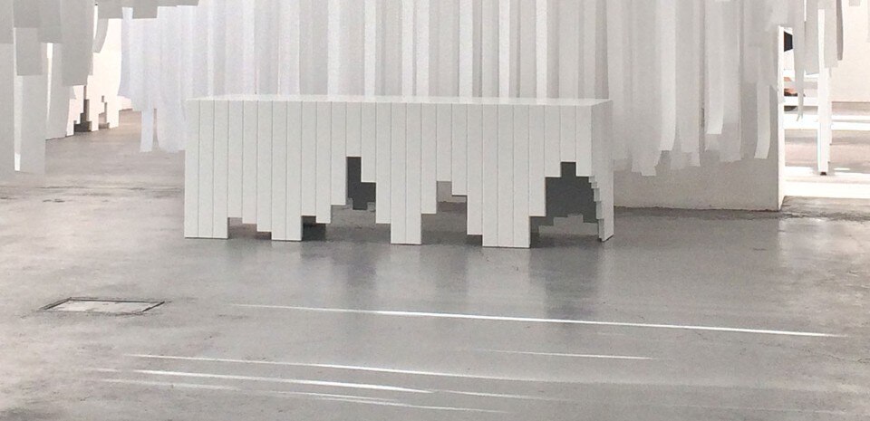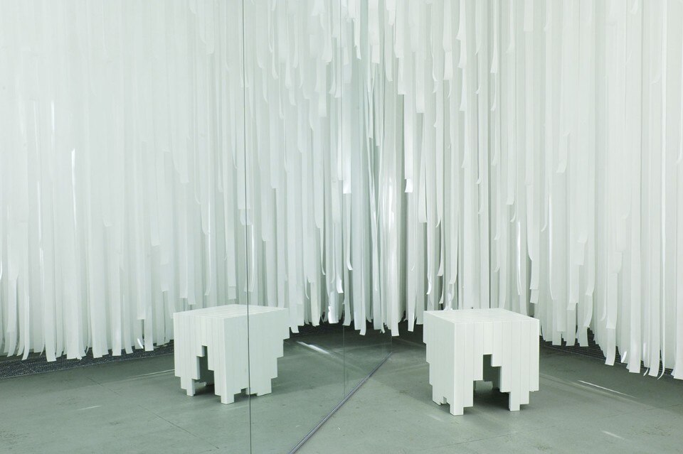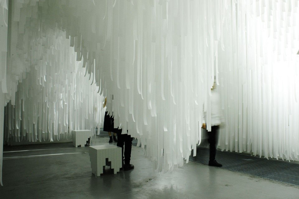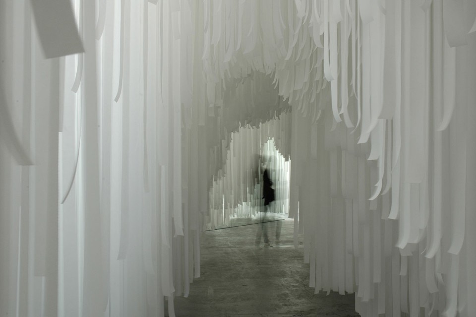 Lo spazio si percorre facendosi largo tra qualche migliaia di strisce di tessuto larghe pochi centimetri che cadono perpendicolarmente al soffitto. Il visitatore è obbligato a interagire con il tessuto, che è protagonista assoluto dell'installazione ed esprime chiaramente qualità di translucenza – lo spazio è immerso nella luce naturale che filtra dalle finestre e attraversa le strisce di tessuto – e di fonoassorbenza – si ha la sensazione di entrare in uno spazio avvolgente e ovattato.
