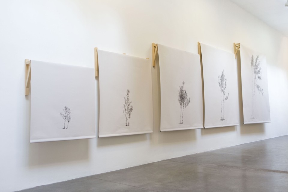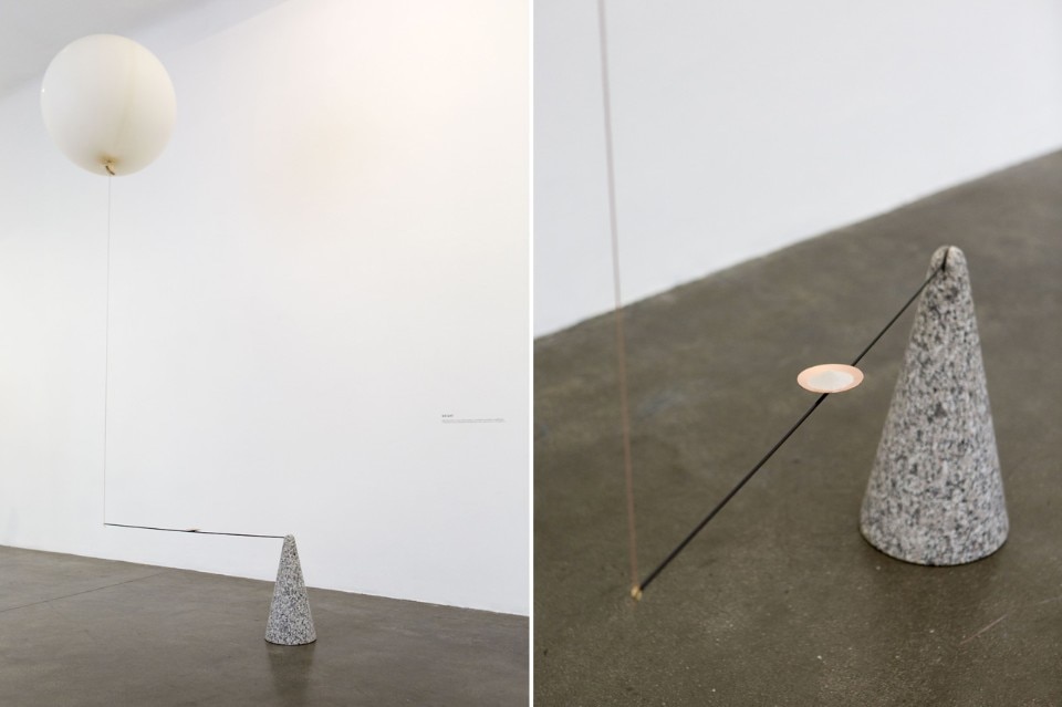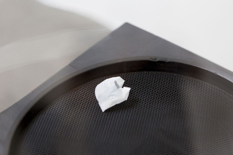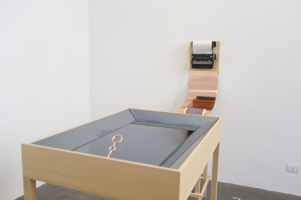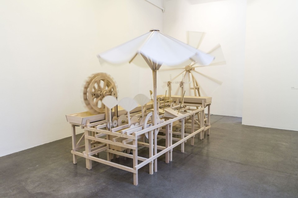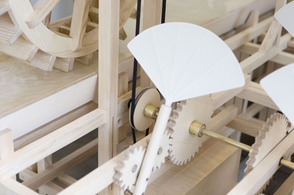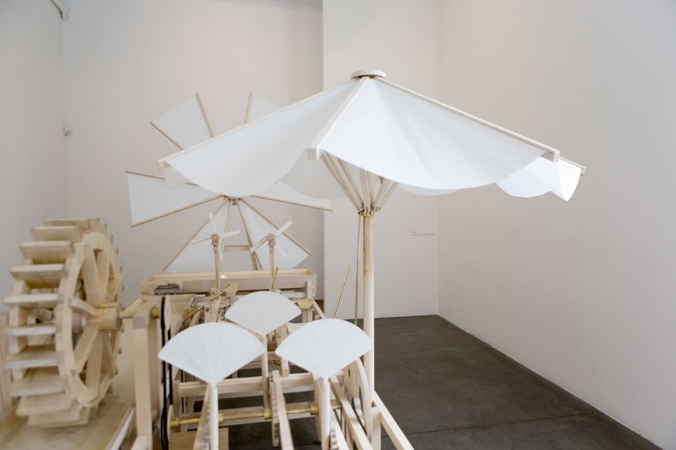 Le opere in mostra svelano e rendono tangibili le diverse qualità dell’aria: una stampante interattiva mette su carta il movimento del respiro a seconda della capacità polmonare di un utente; il peso dell’aria è reso palese invece da un’installazione che mostra la reciproca tensione di diversi elementi; e, ancora, una serie di disegni in china giapponese rappresenta l’effetto dell’aria nel tempo attraverso un albero che cresce. Anche l’acqua è un elemento presente in mostra: nella grande macchina leonardesca che la rappresenta in sinergia con l’aria, dove un grande ventilatore muove un flusso d’acqua che attiva una serie di ventole più piccole connesse tra loro. guarda il video