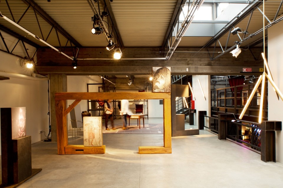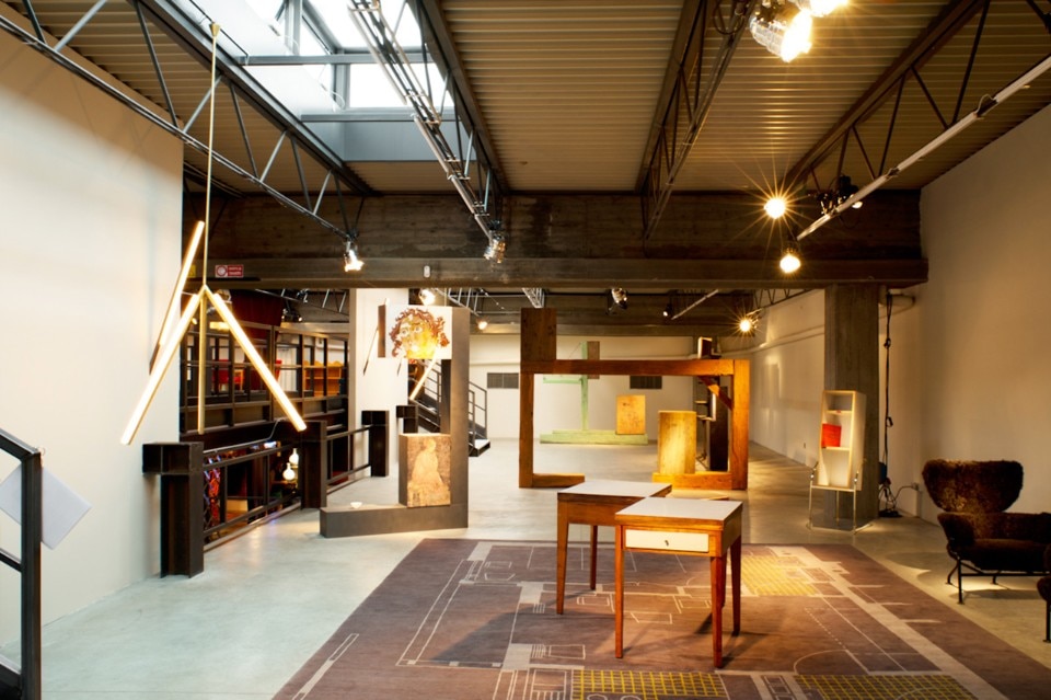 All’interno delle strutture si creano volumi che ospitano piccole scenografie di design curate personalmente da Nina Yashar, dove il design all’avanguardia trova il suo spazio accanto a pezzi iconici di Albini, Perriand, Parisi e altri. Come nel teatro, gli spazi sono scanditi da quinte e tendaggi. Questo spazio superorganizzato in fondo non ha perso la sua funzione primaria di stoccaggio, ma è diventato un palcoscenico di allestimenti improvvisati con l’imponente opera d’ottone lunga sei metri dell’artista Leonor Antunes come sipario centrale