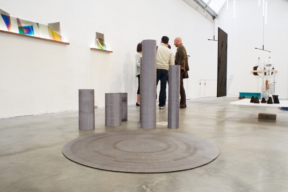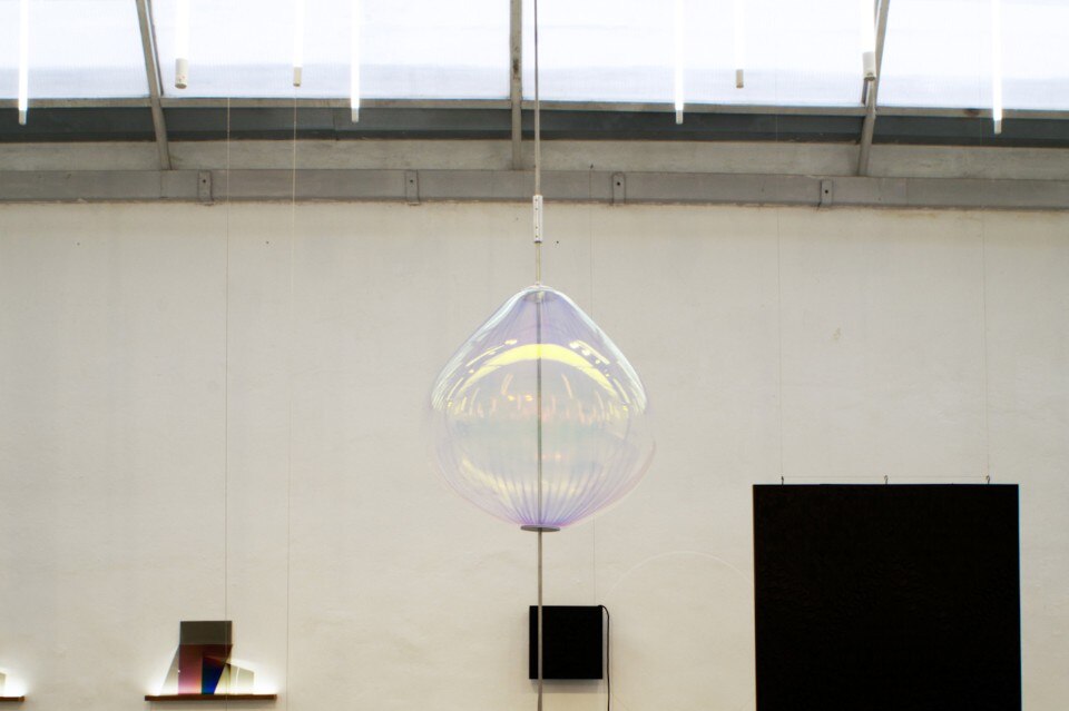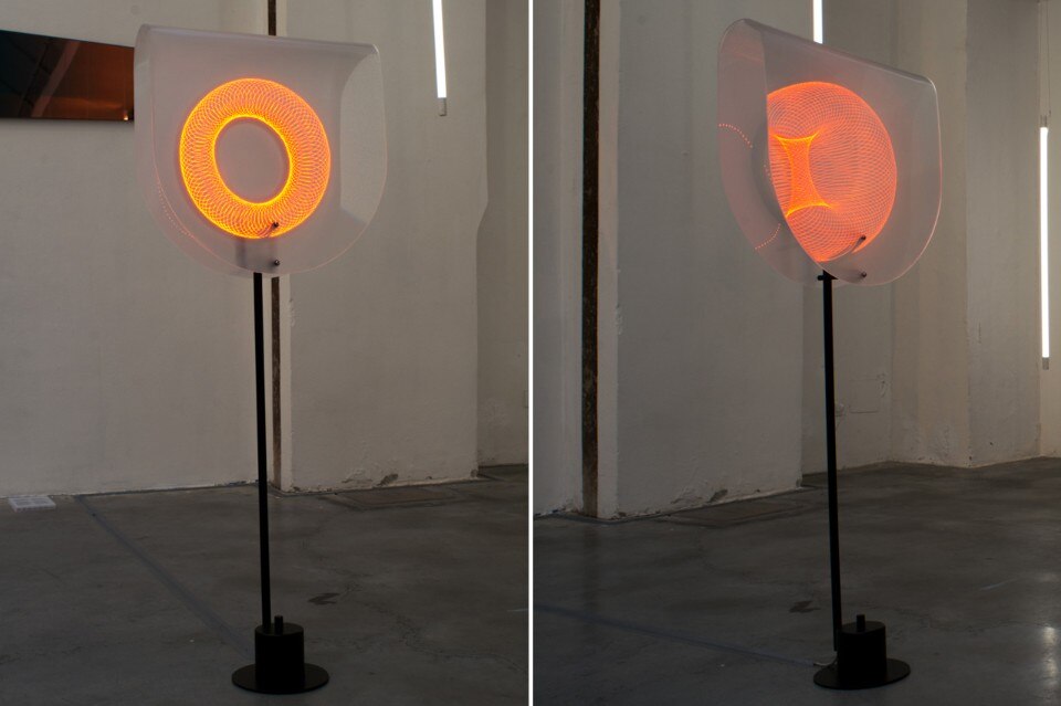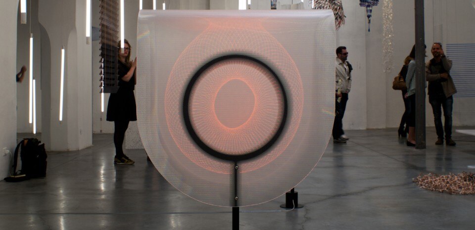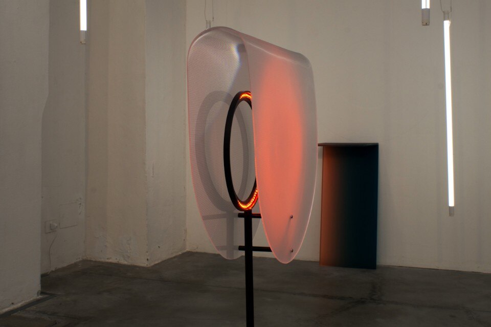 In mostra troviamo lampade create con strisce di carta disegnate secondo pattern fissi che si modificano una volta che i fili vengono intrecciati, un tappeto fatto di cordoni per tende di diametri differenti che si uniscono creando una forma sfuggente, uno specchio composto da strati di materiali differenti visibili in sezione la cui superficie irregolare deforma in modo differente in base all’angolo di osservazione, pareti con disegni finissimi tagliati al laser che si muovono con il soffio, specchi che tengono sotto controllo il nostro battito cardiaco, contenitori con spessori differenziati e sfumature cromatiche studiate per destabilizzare la nostra percezione… e tanti altri oggetti per farci riflettere sulle possibili nuove interazioni dello spazio con il nostro corpo.