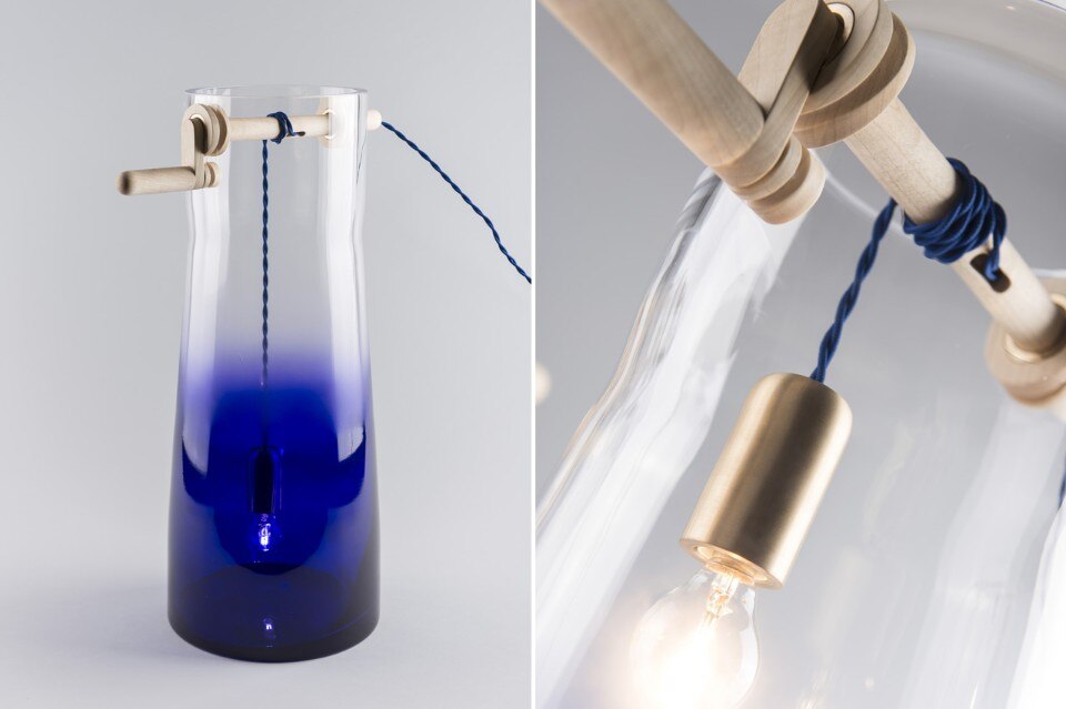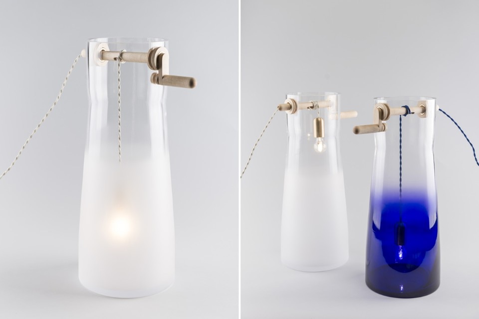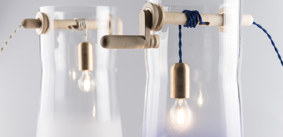 I contenitori sono stati soffiati in stampi di legno e perforati nella in parte superiore per accogliere la maniglia. Le parti del manico sono in legno di acero oliato combinato con elementi in ottone. Il portalampada è rivestito di ottone per renderlo più pesante e più facile da far scorrere in linea retta. Il cavo in tessuto è un rimando alle funi utilizzate nei pozzi d’acqua reali.