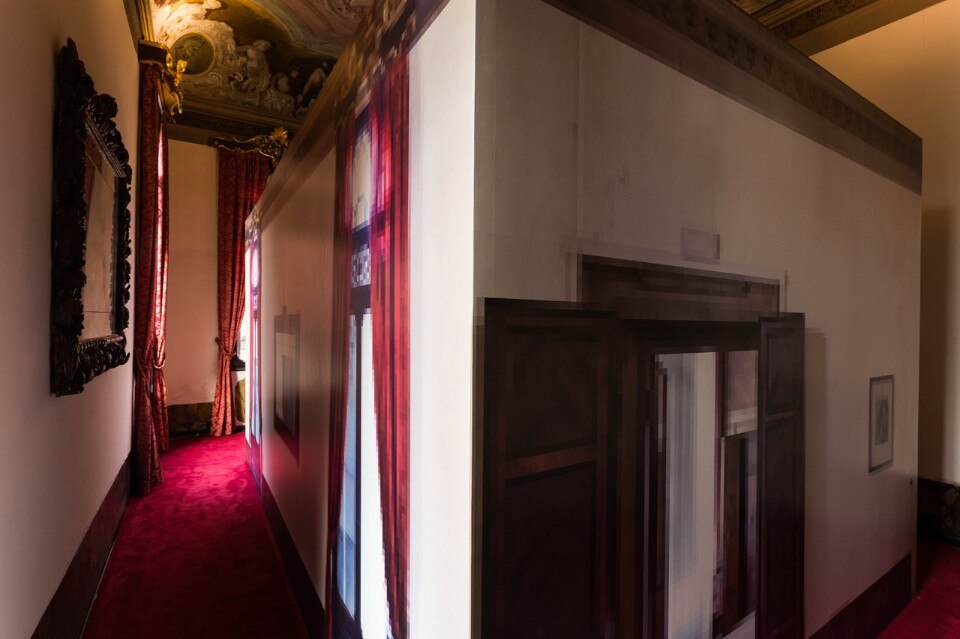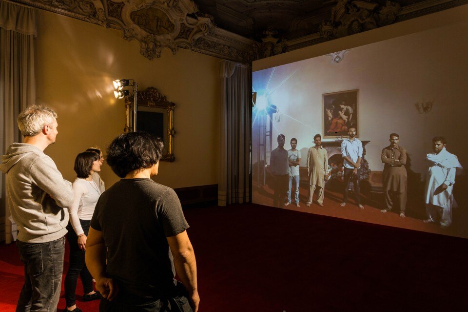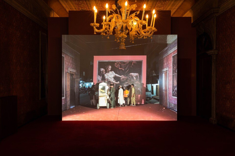 Rashid Rana presenta un ambiente immersivo che attraversa cinque stanze indagando i concetti di presenza, temporalità e posizione come esperienza collettiva, attraverso la stampa digitale, il video e l’installazione. In un lavoro video in diretta streaming, realizzato in collaborazione con la Fondazione Biennale di Lahore, gli spettatori vengono trasportati da Venezia a Lahore e viceversa.