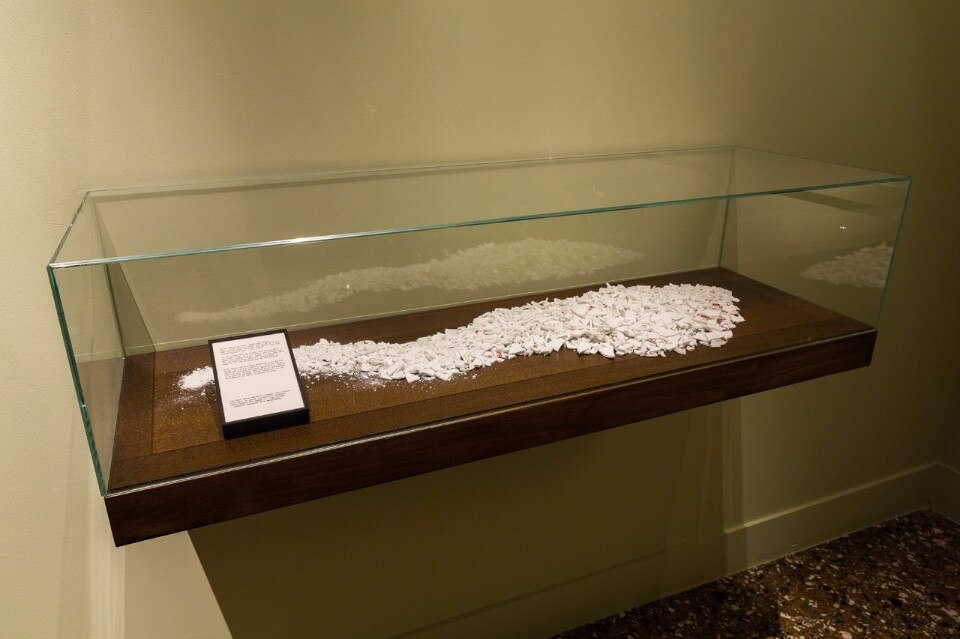 Tra queste opere, il pezzo 998,9 – commissionato da Kvadrat – affronta il tema degli oltre 3,400 km di filo spinato che segnano il confine tra India e Bangladesh. Srotolandosi tra Sunderbans e Teen Math, questo recinto tenta di proteggere l’India dal terrorismo e dal contrabbando, ma crea anche un limite potenzialmente letale per la popolazione nelle zone umide del delta del Bengala che vivono in un ambiente instabile soggetto agli effetti dei cambiamenti climatici. Per dare voce a questo conflitto poco conosciuto, Shilpa Gupta ha creato 998,9: 3.394 metri di stoffa tessuti a mano dalla gente di Phulia, una città di confine del Bangladesh indiano. Nel 2016 Kvadrat donerà 998,9 al Louisiana Museum of Modern Art, in Danimarca.