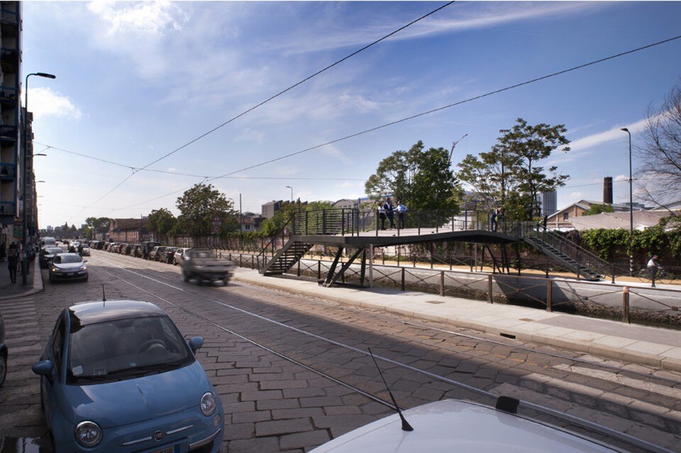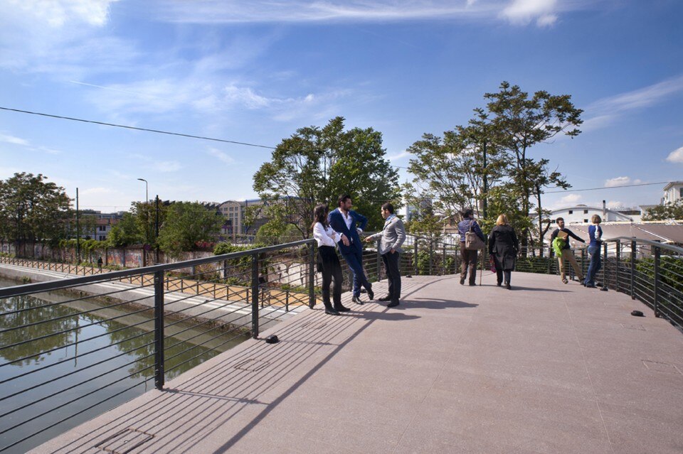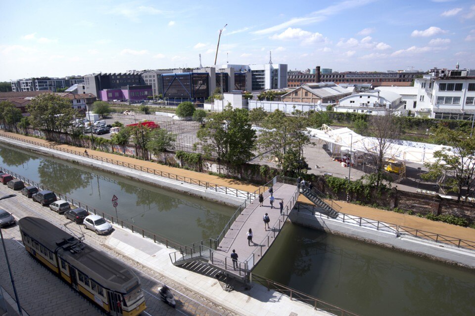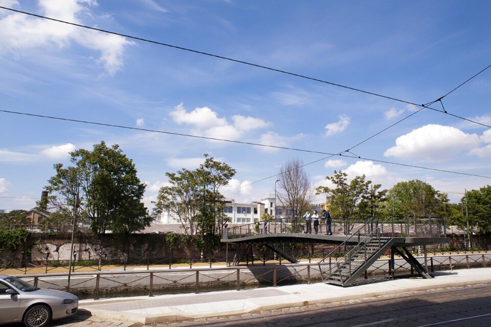 Il ponte pedonale collega Ripa di Porta Ticinese con l’Alzaia Naviglio Grande, ricucendo un pezzo di città che per troppo tempo è rimasto separato. Oggi la pedonalizzazione del tratto di Alzaia dal nuovo ponte fino a quello di via Valenza aggiunge valore e godibilità a questo tratto di naviglio.