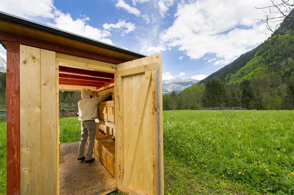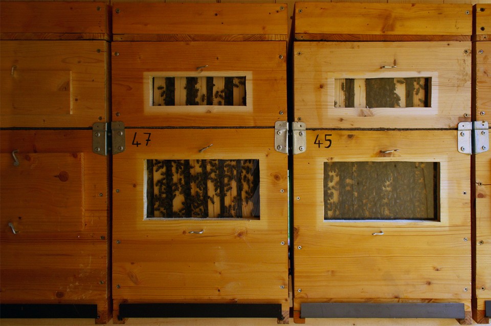 Il volume interno della Bienenhaus si compone di tre ambiti funzionali distinti, individuabili in tre ideali fasce parallele tra loro: lungo la facciata sud trovano posto le arnie disposte su due differenti livelli, lungo la facciata a nord vengono immagazzinati i melari e l’attrezzatura apistica, infine la fascia centrale è il luogo di lavoro dell’apicoltore durante le sue visite all’apiario.