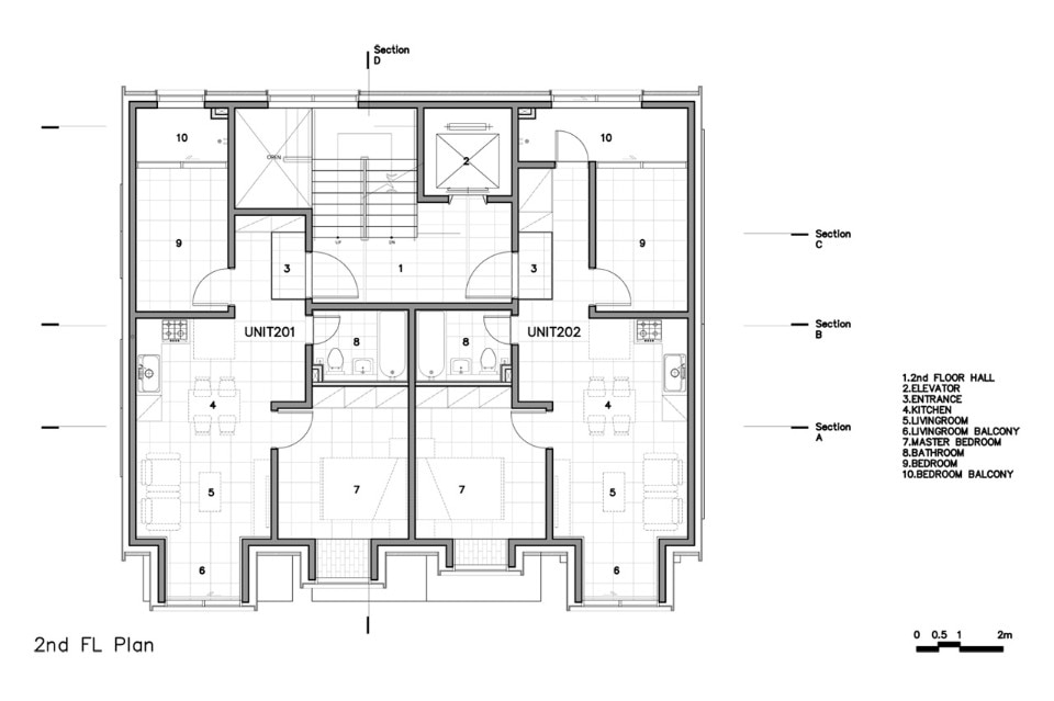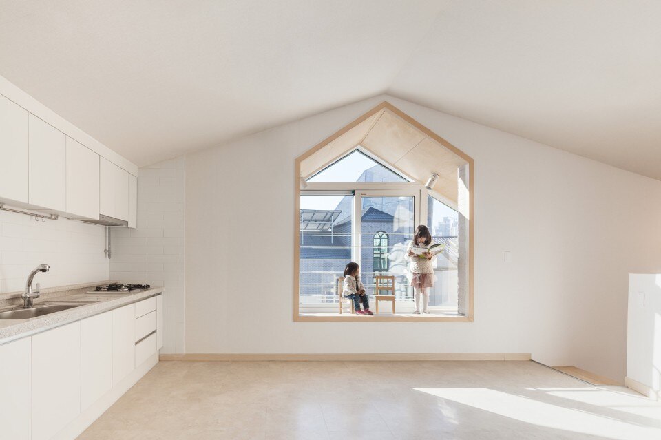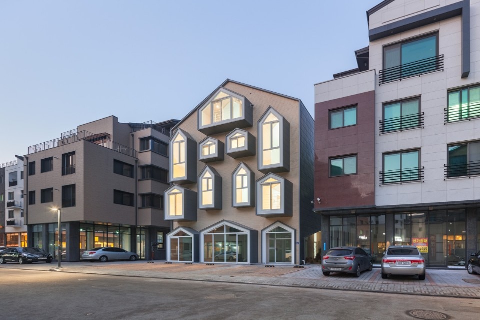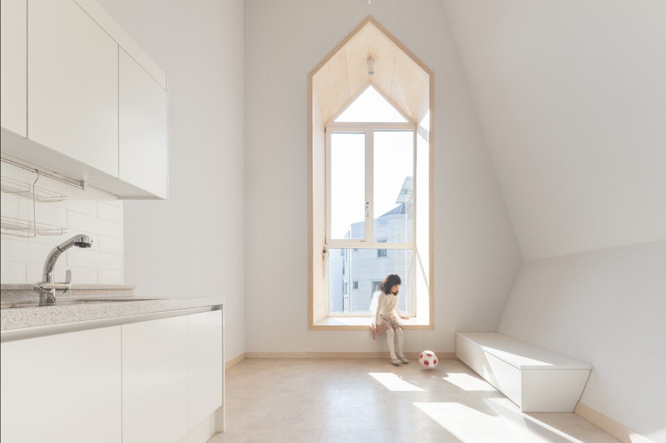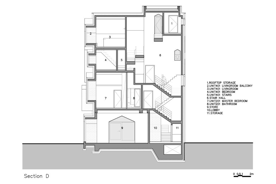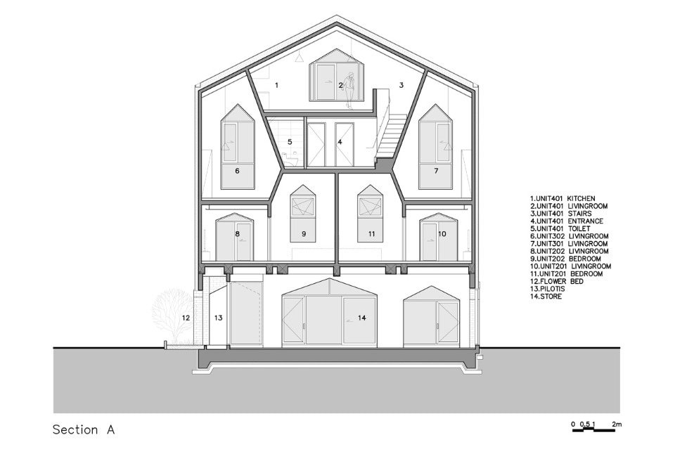 Invece di seguire la “formula” della zona, con Gablepack AND (Architecture of Novel Differentiation) propone cinque unità residenziali di dimensioni pari a 66 mq. Pertanto, tutte le unità possono avere due camere da letto di dimensioni ragionevoli e un soggiorno. Questa disposizione riflette la domanda locale, composta per la maggior parte da coppie con un figlio.
