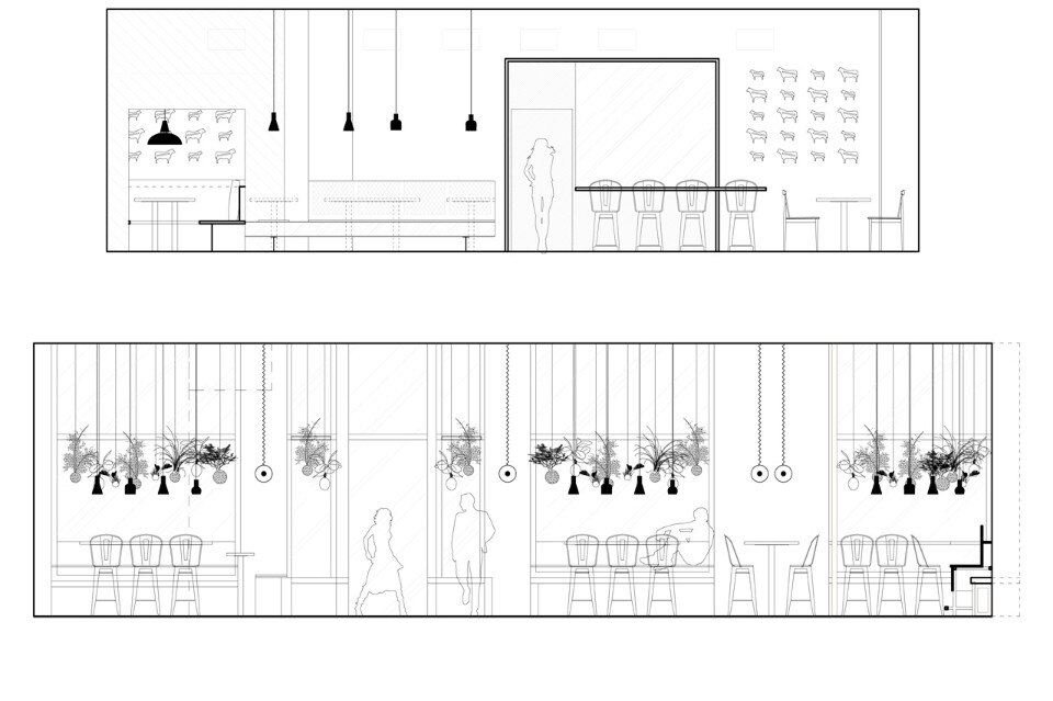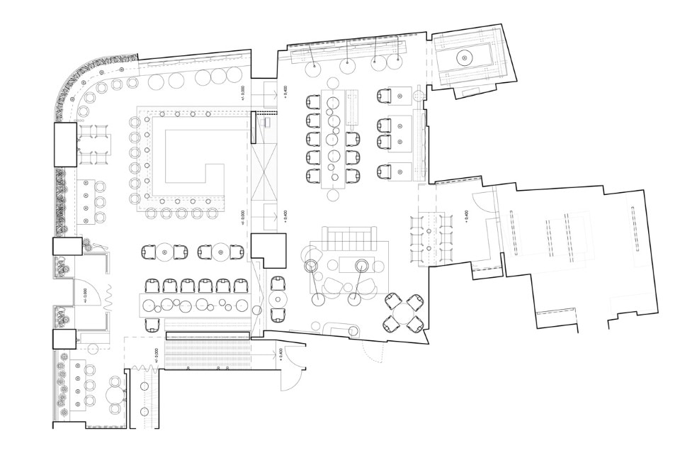 Gli architetti Dagmar Štěpánová e Katarina Varsova dello studio Formafatal, che ha progettato gli interni, hanno diviso lo spazio in due parti principali, impostati a due livelli differenti. Il luminoso ingresso è dominato da un bar centrale, mentre sul retro si trova una zona più intima con tavoli, una zona chill-out con poltrone e un “salotto”.