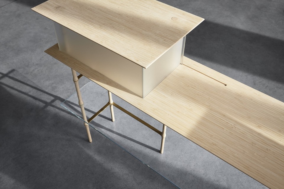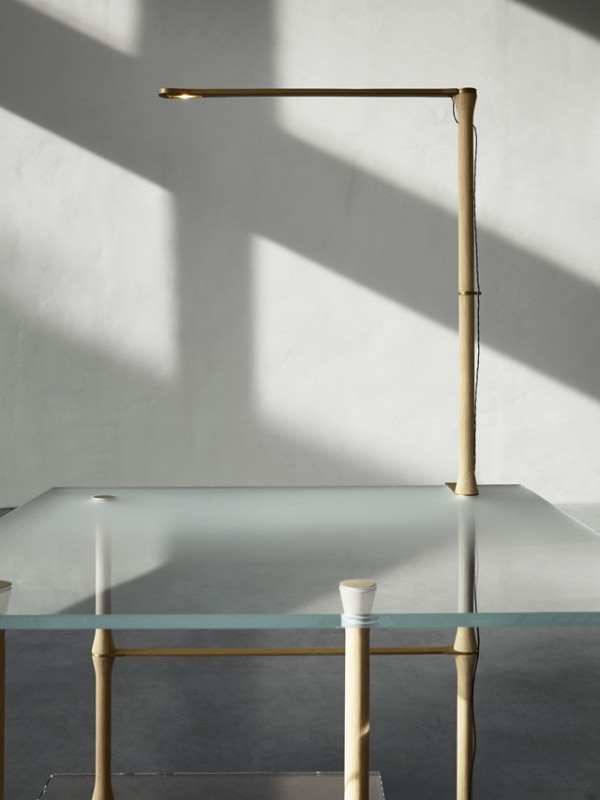 I nodi naturali dello stelo sono stati ricreati artificialmente con il tornio e nascondono un meccanismo di giunzione che permette l’incontro tra questi elementi verticali, la superficie piana di vetro e i volumi dalle geometrie essenziali.