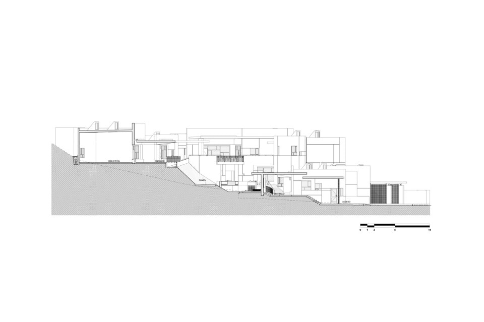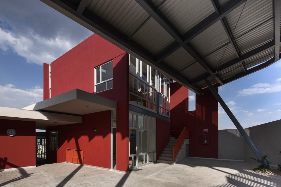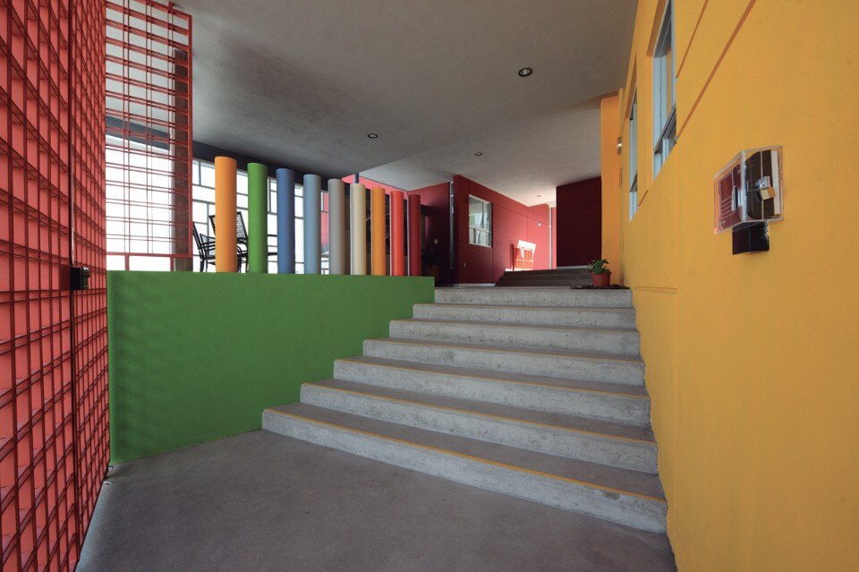 I volumi sono collegati da diverse lastre orizzontali verniciate in colori neutri, in contrasto con i cubi. Queste lastre coprono i percorsi esterni e ombreggiano il perimetro del cortile. La scuola è stata progettata seguendo l’idea di “montaggio”: i pezzi che formano la composizione sono chiaramente individuabili e ogni elemento è individuabile grazie a geometria e colore.