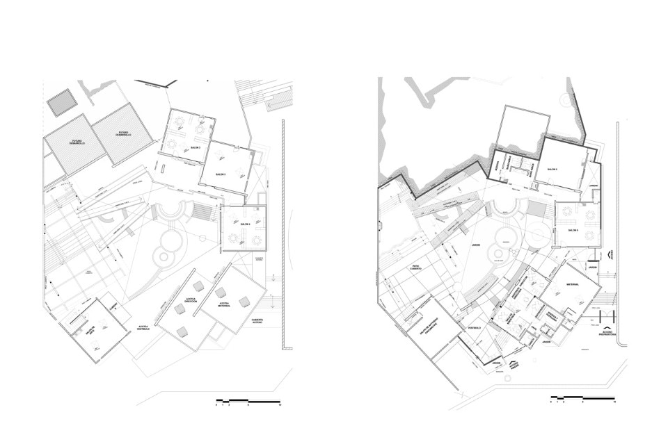 I volumi stessi seguono questo principio nella composizione delle aperture, nel trattamento delle pareti e nel disegni dei serramenti. Gli elementi nel cortile centrale sono progettati con una geometria giocosa. Curve e cerchi disegnano fioriere, passerelle, la sabbionaia e i giochi d’acqua. Le rampe e i terrapieni hanno invece forme triangolari. Una parete, di colore verde brillante, segue una forma a zig-zag.