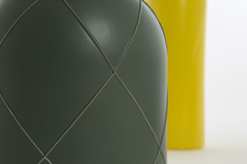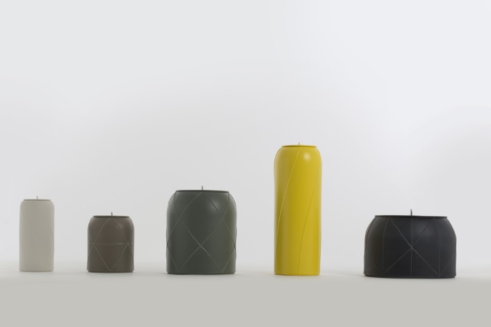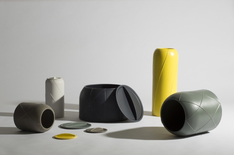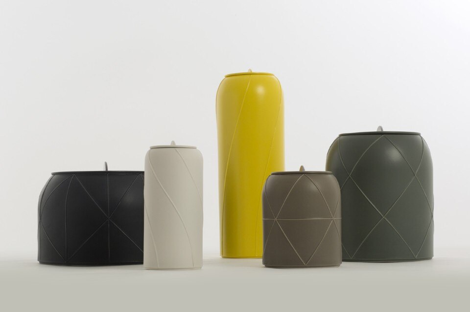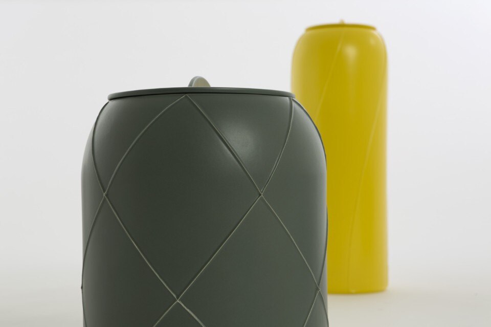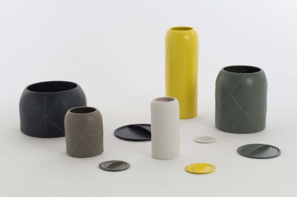 Ciascuno dei vasi prende forma dalla forma industriale archetipica del contenitore in metallo, controbilanciata dal dettaglio decorativo. I colori pastello e lo smalto opaco sono in sintonia con le forme e mantengono l’attenzione sugli elementi decorativi.