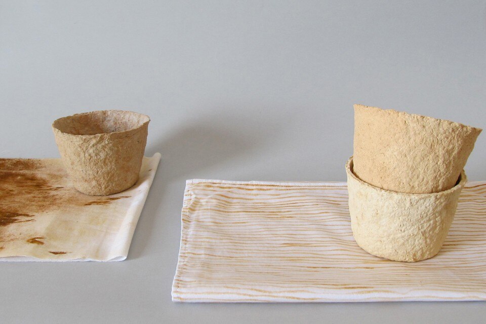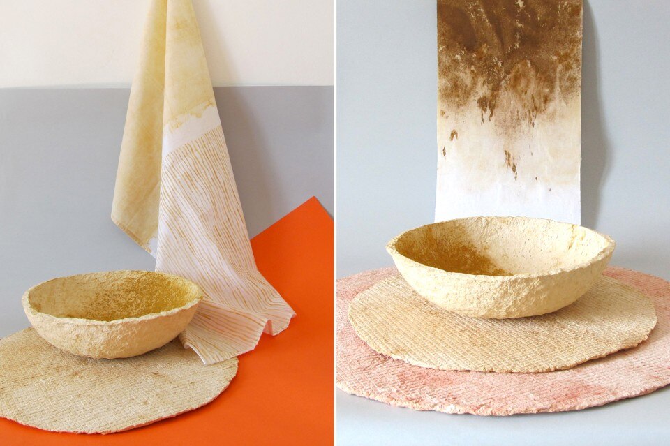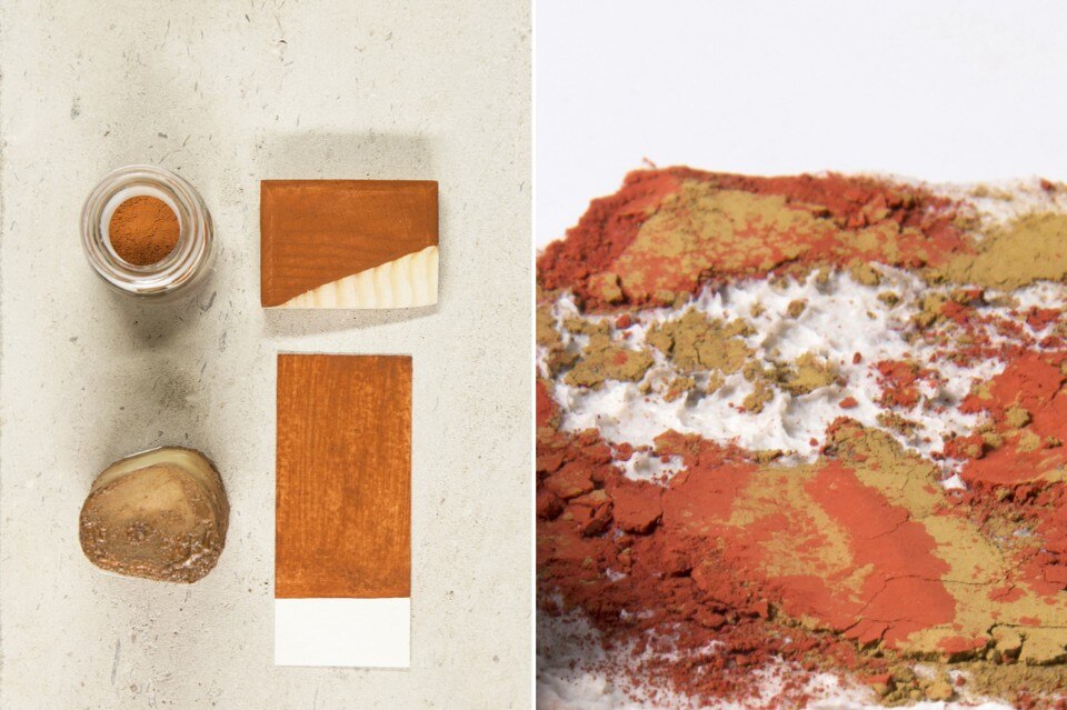Burnt sienna esplora questo processo di realizzazione del colore, che trasforma il giallo ocra in una serie di sfumature rossastre, e lo traduce in oggetti contemporanei come i tessuti e una serie di vasi.