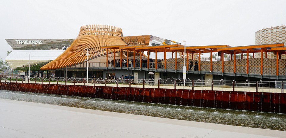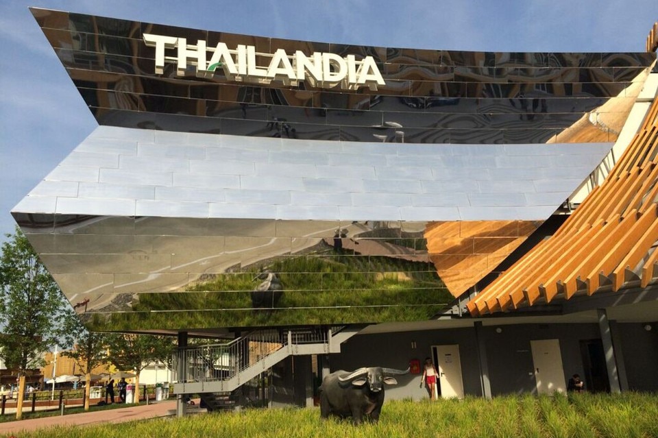 Il cappello tipico dei coltivatori di riso e la creatura simile a un drago che rappresenta gli spiriti della natura, portatori di acqua e fertilità, danno forma al padiglione tailandese a Expo.