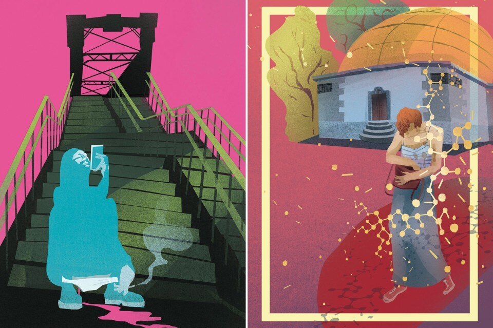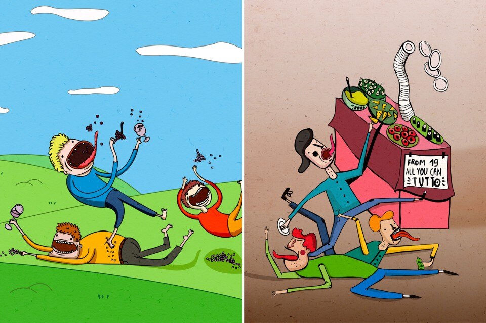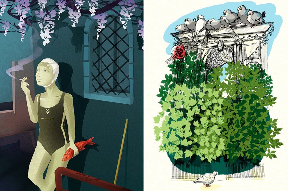 A sinistra: Lara Orrico, La vendemmia, Arco della Pace. A destra: Lara Orrico, Sushi prima degli esami, Zona Bocconi