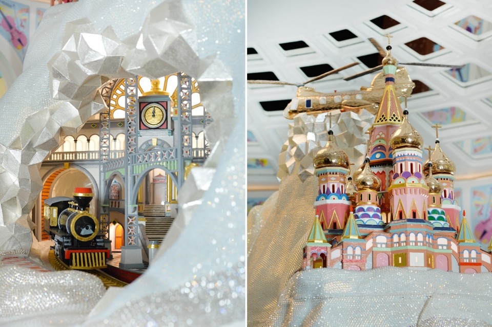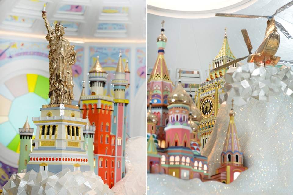 Le superfici dei pannelli sono ricoperte di carta progettata appositamente per questa instllazione. Intorno alla stanza sono disposte applique in bronzo che sono classiche e contemporanee al tempo stesso. Tutto è policromo, brillante e scintillante. L’atmosfera è surreale, monumentale e colorata.