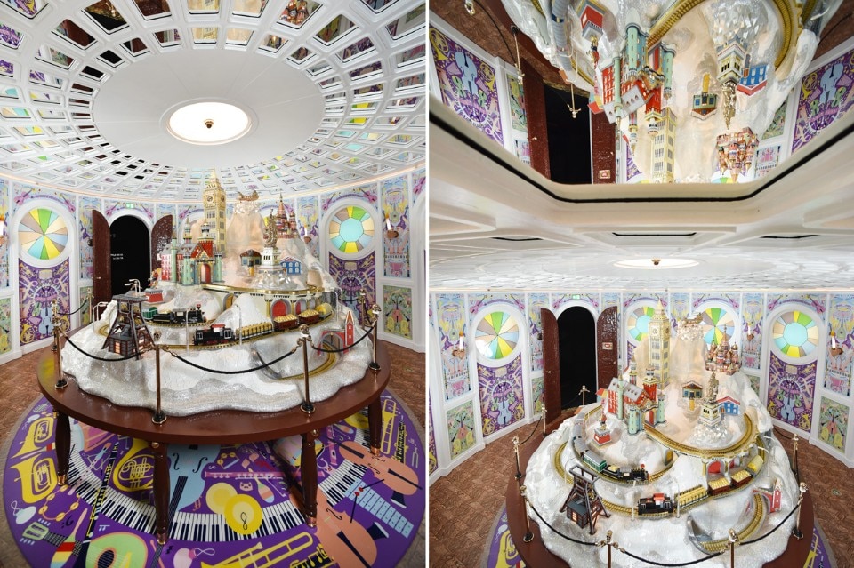 Entrando attraverso una doppia porta, si entra in uno spazio circolare di 9 metri di diametro. Si percepisce immediatamente che l’intero spazio è parte di un’installazione totale. Una pannellatura monumentale circonda lo spazio e le grandi finestre rotonde sono retroilluminate, dando l’illusione che si aprano su uno spazio esterno. In modo caleidoscopico, le vetrate moltiplicano il punto di vista come un grande diamante.