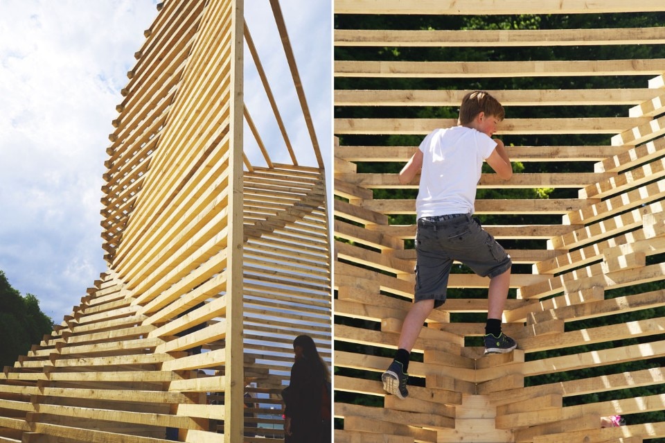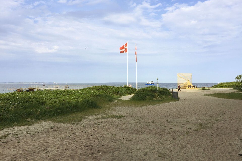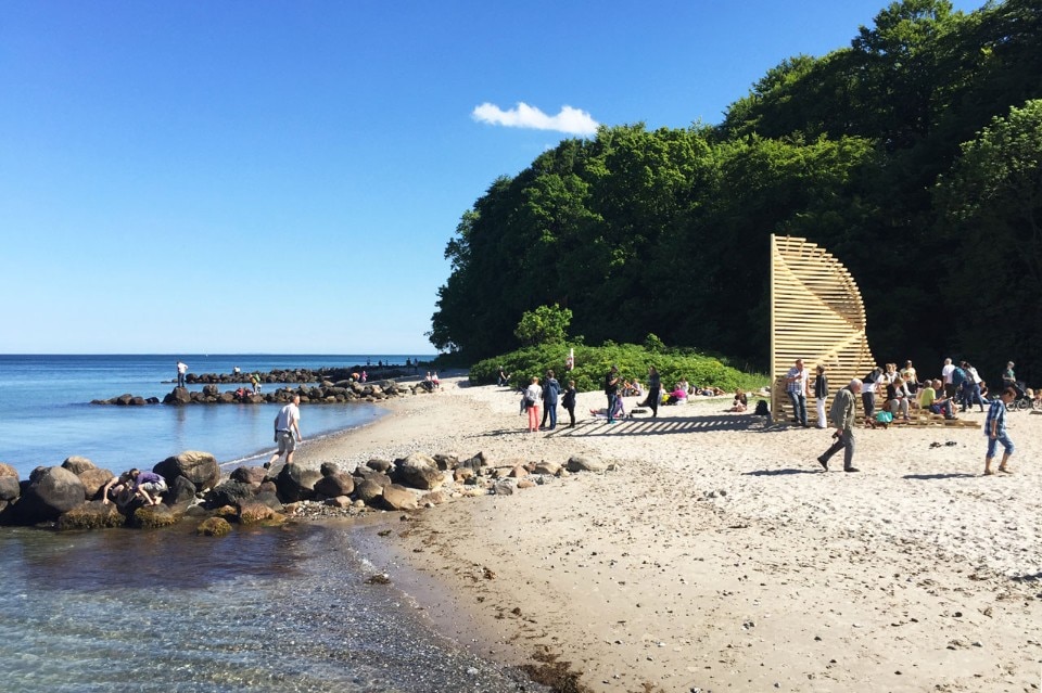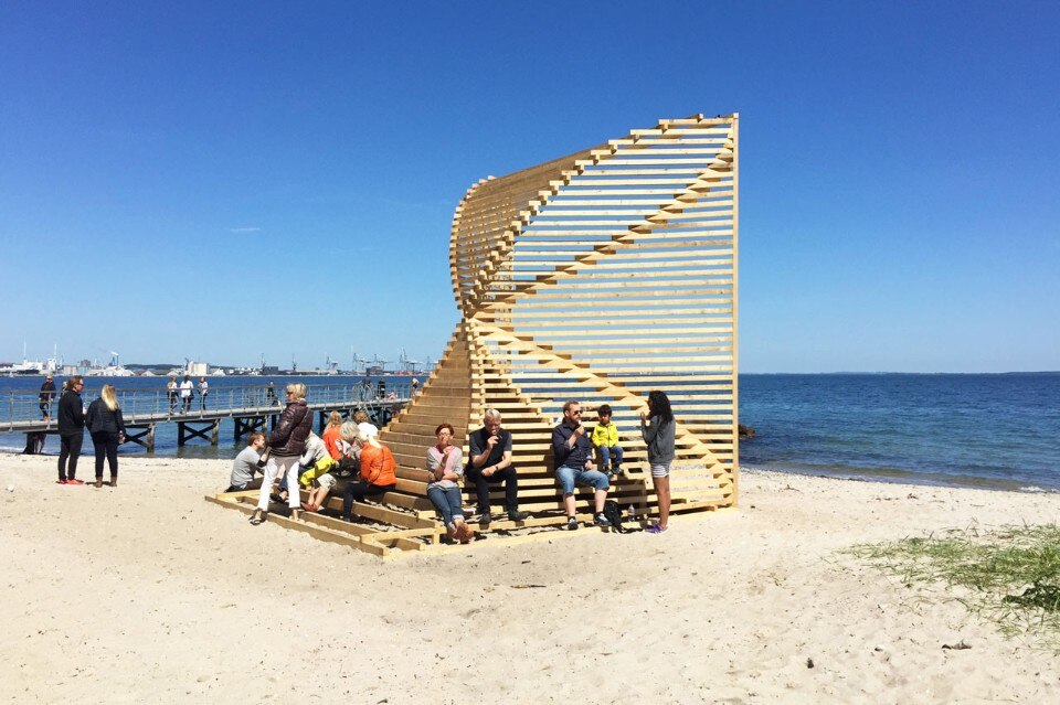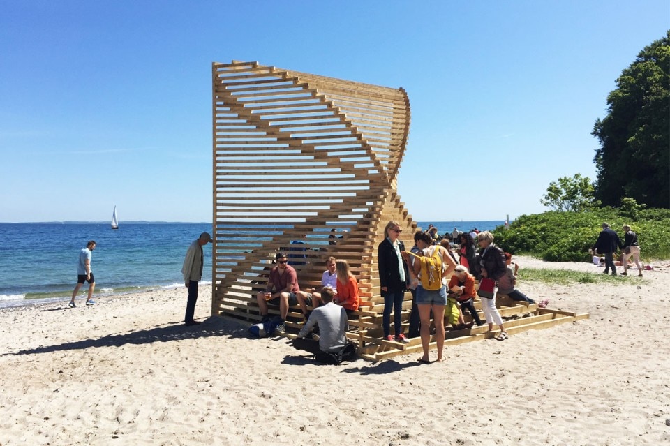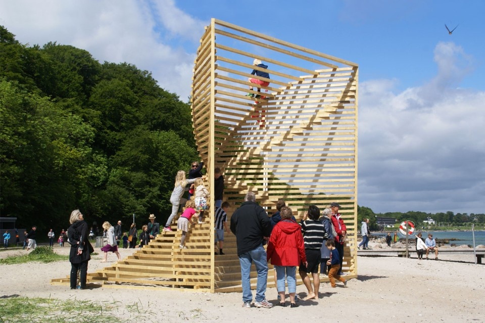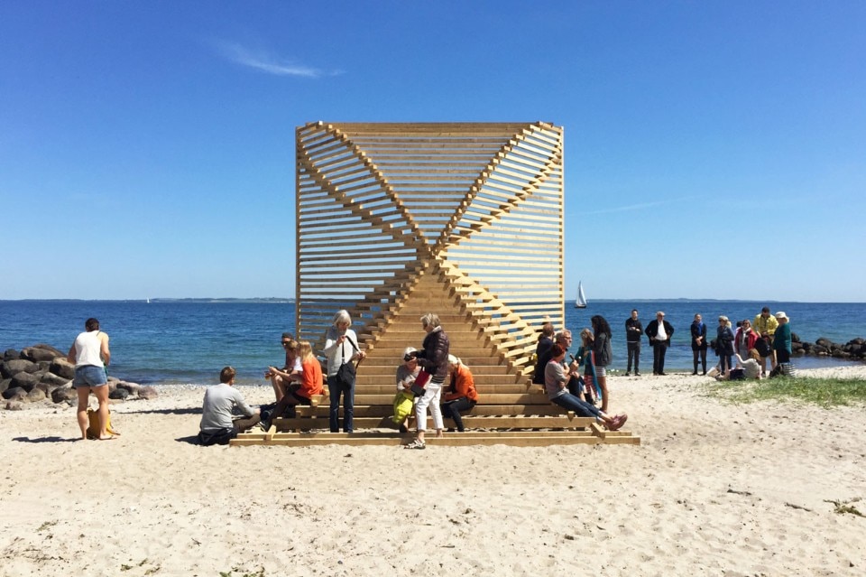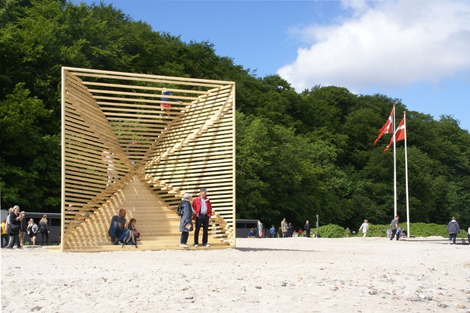 Le doghe in legno della scultura imitano gli effetti plastici della frastagliata costa danese. Un gioco di trasparenze crea un effetto marezzato che vibra camminando e muovendosi intorno alla struttura. Sømærke vuole essere un faro sulla costa che offre orientamento nello spazio e nel tempo.