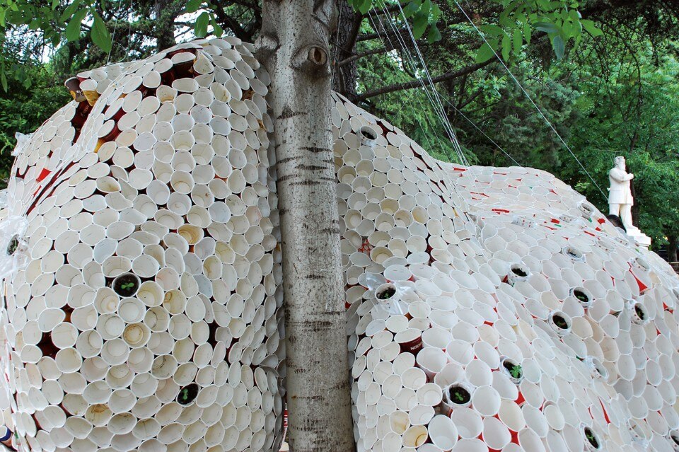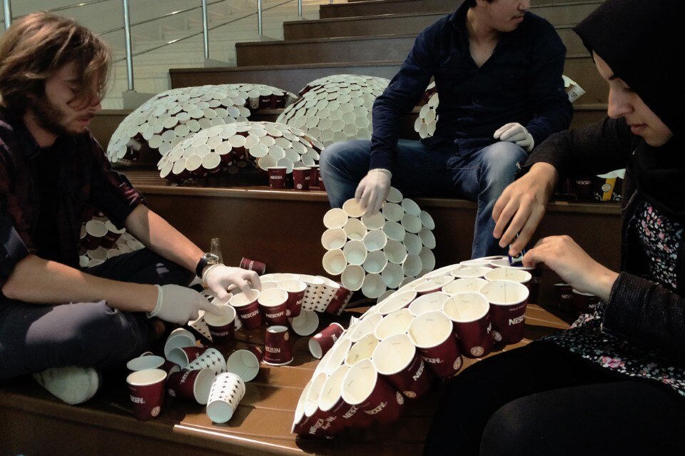 Il padiglione è stato costruito da studenti di architettura nell’edificio della facoltà e poi spostato nell’area espositiva. La forma del padiglione è stata progettata, tuttavia a causa delle condizioni atmosferiche della giornata, è stato appeso tra gli alberi e sostenuto da colonne. Ogni colonna era composta da circa 300-400 tazze. È rimasto sul sito per sole quattro ore ottenendo l’attenzione del pubblico e suscitando una discussione pubblica.