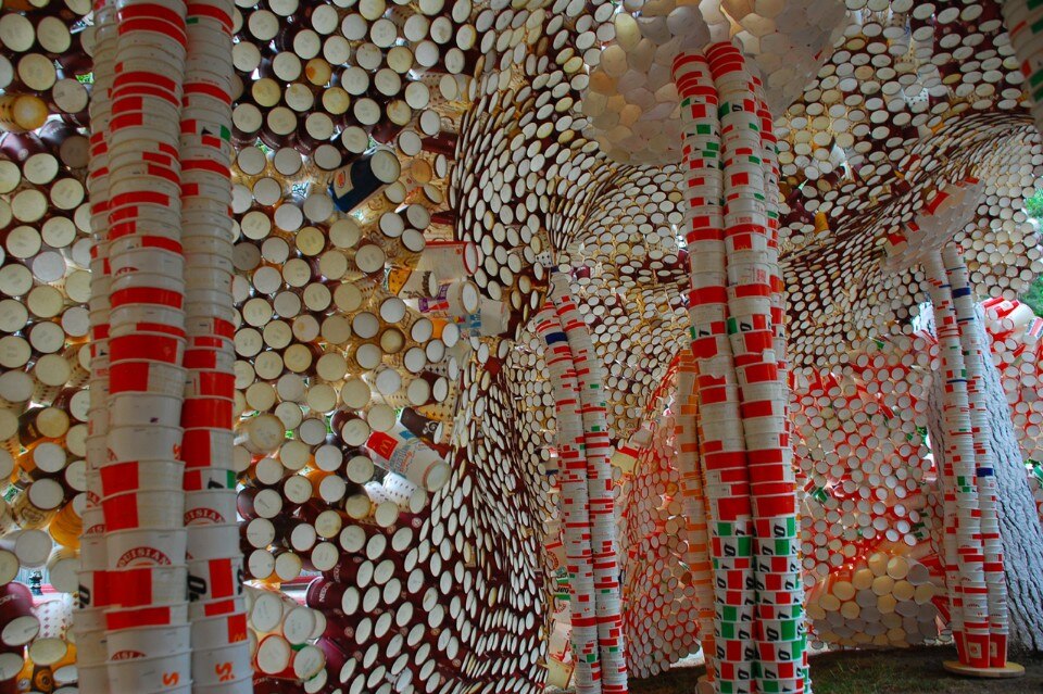 Il padiglione di bicchieri di carta è stato costruito con bicchieri da tè e caffè usati raccolti nelle mense universitarie e in un centro commerciale per un periodo di tre mesi. Circa 15.775 bicchieri, raccolti come mattoni per il padiglione, sono stati lavati e asciugati. I bicchieri sono tenuti insieme con 4 kg. di punti metallici e cuciti con filo per assicurare stabilità strutturale.