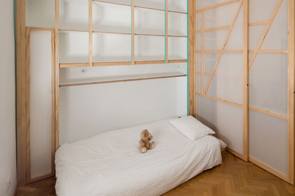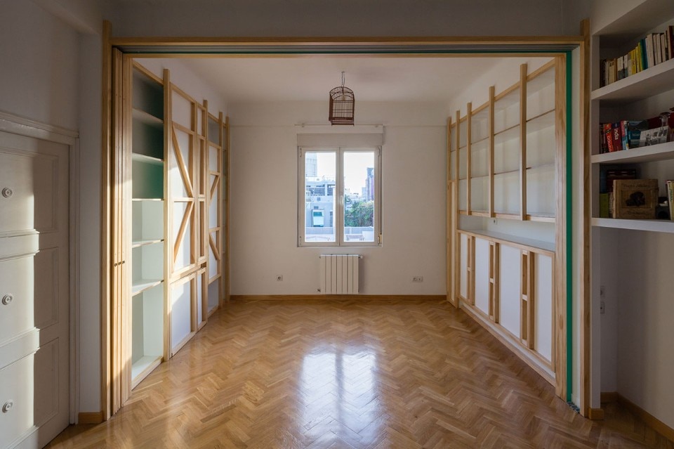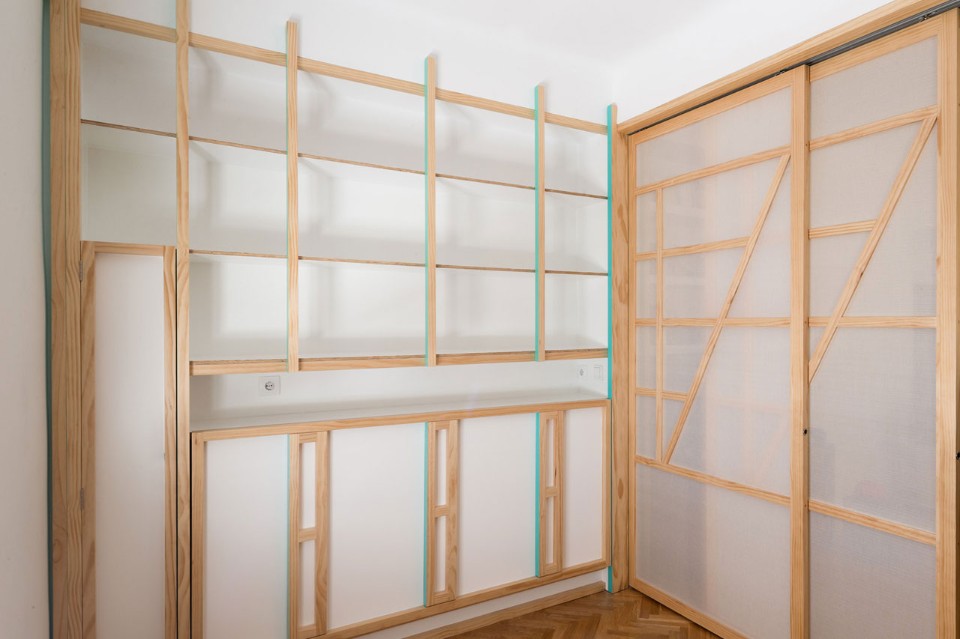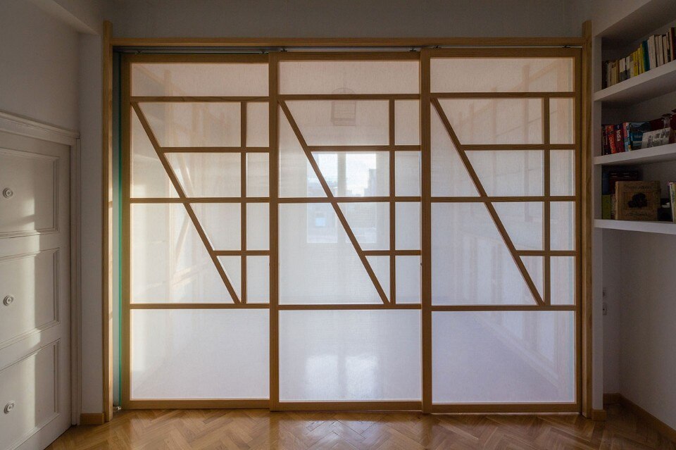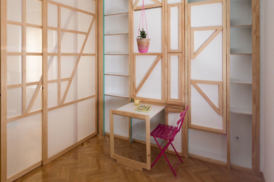 La terza strategia è l’integrazione di una serie di dispositivi ribaltabili e scorrevoli per suddividere gli spazi, trasformando uno spazio di lavoro in un grande tavolo da pranzo, un letto per un ospite a sorpresa, una spaziosa area per praticare lo shiatsu o riorganizzare l’armadio.