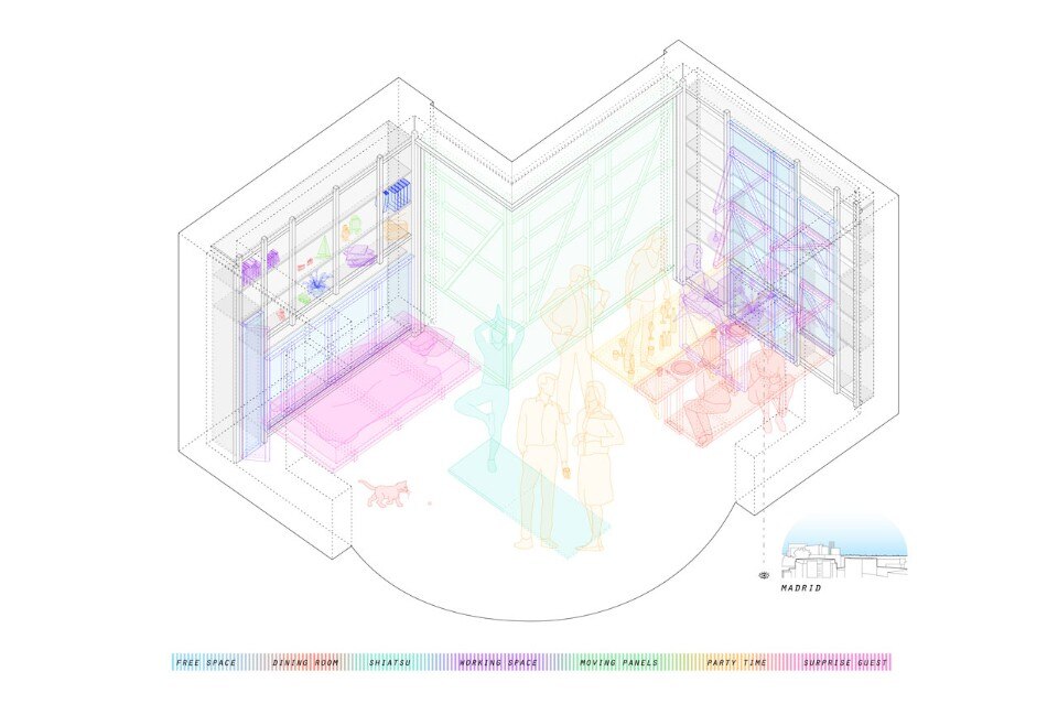 La seconda strategia comporta l’apertura degli elementi di separazione per ampliare alcuni spazi come il salotto in modo da aumentare l’ingresso di luce naturale e valorizzare la vista su Madrid.