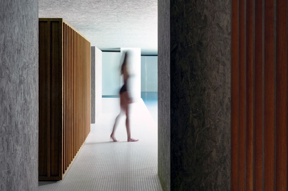Lo spazio ipogeo che accoglie la piscina, spogliatoi, zone fitness/relax e una piccola cucina e palestra si organizza attraverso una sequenza di volumi dalla geometria elementare realizzati in legno di rovere o in cemento faccia a vista.
