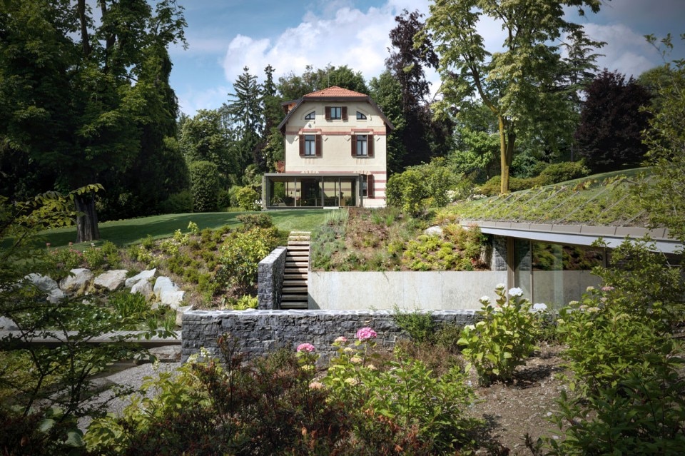 La realizzazione di questo nuovo volume completamente vetrato, direttamente collegato con lo spazio esterno, ha permesso di rimodellare su questo lato anche il livello del parco in modo da mettere in relazione diretta il piano del giardino con il piano terra della residenza.