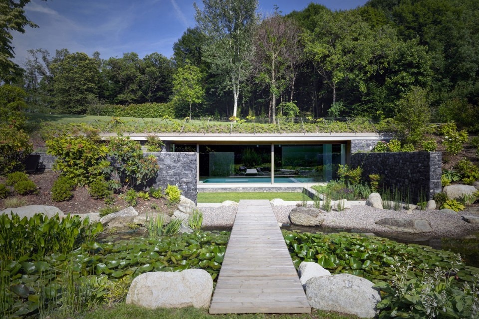 Il padiglione è collegato alla residenza principale attraverso un percorso anch’esso ipogeo che, con un andamento planimetrico irregolare per evitare alcuni alberi d’alto fusto preesistenti, porta attraverso una scala a uno spazio totalmente vetrato che si apre sul parco circostante. Questo ampio giardino d’inverno mette in relazione gli spazi della casa con il percorso che porta al padiglione della piscina. Un sottile collegamento vetrato a ponte collega il giardino d’inverno con la villa.