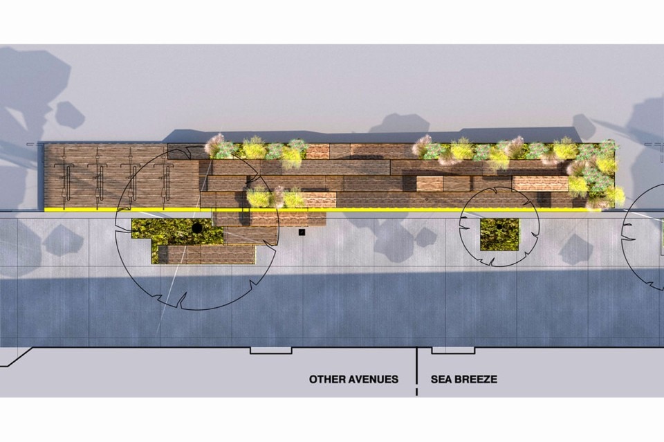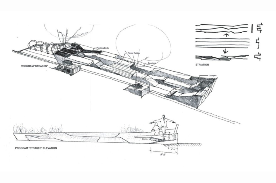 Strisce singole salgono e scendono creando adiacenze complesse e offrendo una ricca gamma di opportunità, programmi e letture formali. Il risultato finale è una forma astratta coinvolgente, confortevole e funzionale allo stesso tempo. Da alcune angolature assomiglia a una grande chiatta, o alle imbarcazioni che trasportano i passeggeri alla vicina spiaggia, mentre dal punto di vista dei pedoni offre uno spazio in legno, caldo e accogliente rispetto al marciapiede in cemento, in cui rilassarsi, giocare, incontrarsi con gli amici, raccontare storie, pranzare, o semplicemente leggere un libro circondati da erbe autoctone.