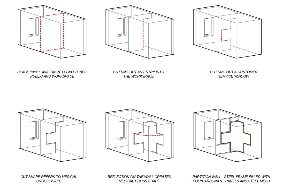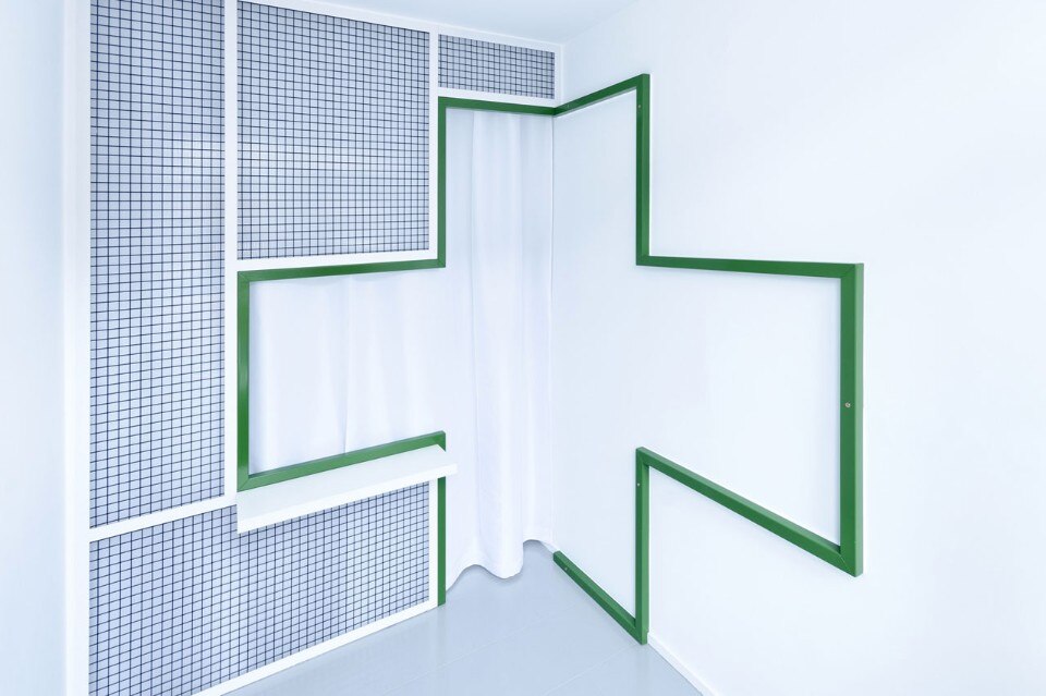 L’ingresso allo studio e lo sportello informativo sono stati tagliati nella parete divisoria e possono essere chiusi da una tenda. La rete di acciaio e lo sportello sono un riferimento esplicito ai vecchi chioschi e indicano la tipologia di servizio “espresso” offerta dalla società. Lo spazio è caratterizzato dalla sagoma di una croce verde, che disegna il profilo delle aperture nella parete divisoria e prosegue sul muro adiacente.