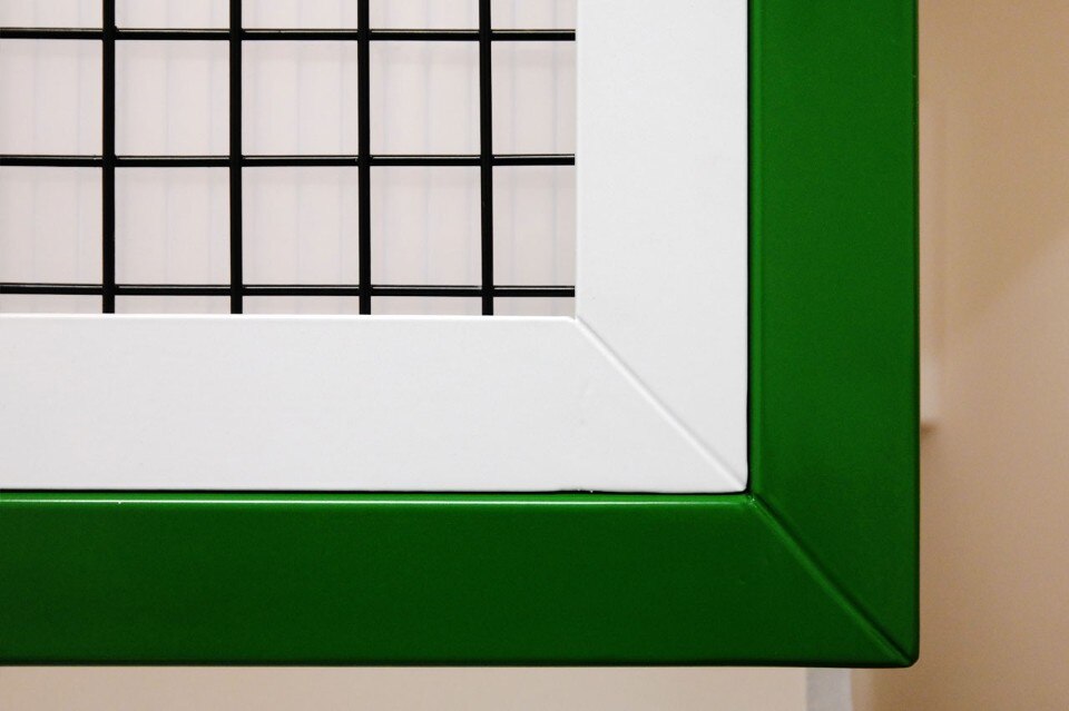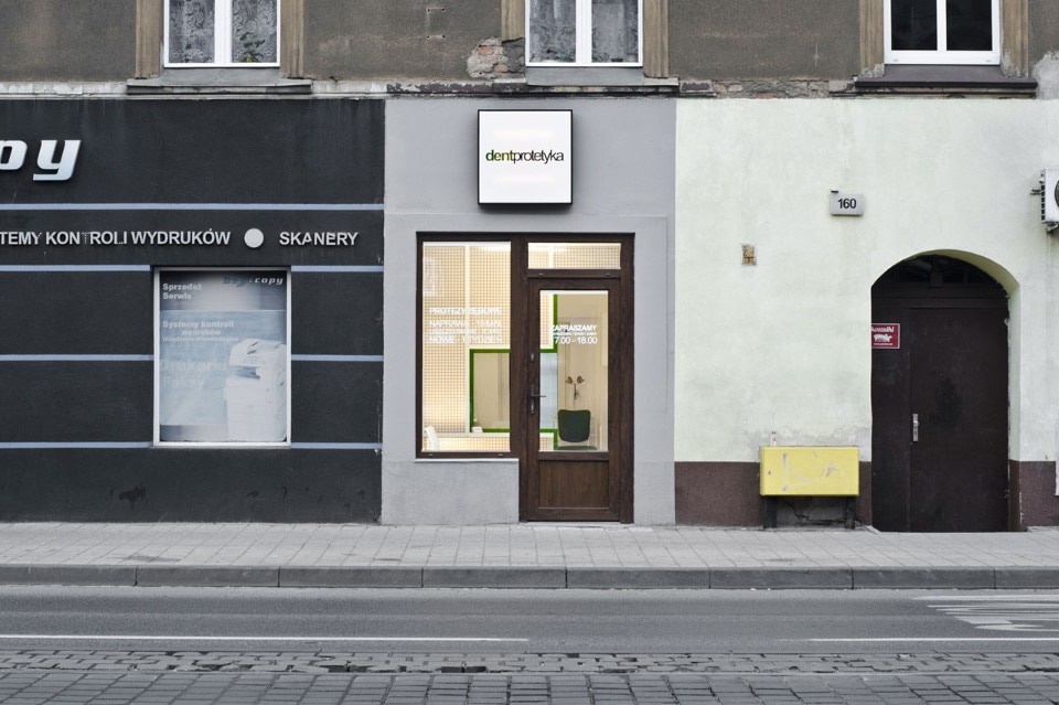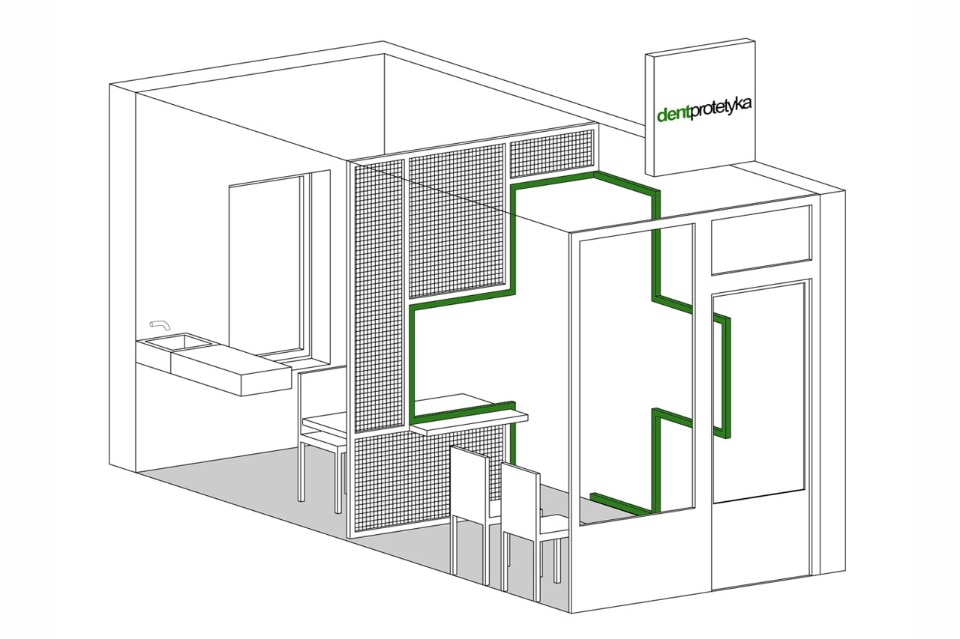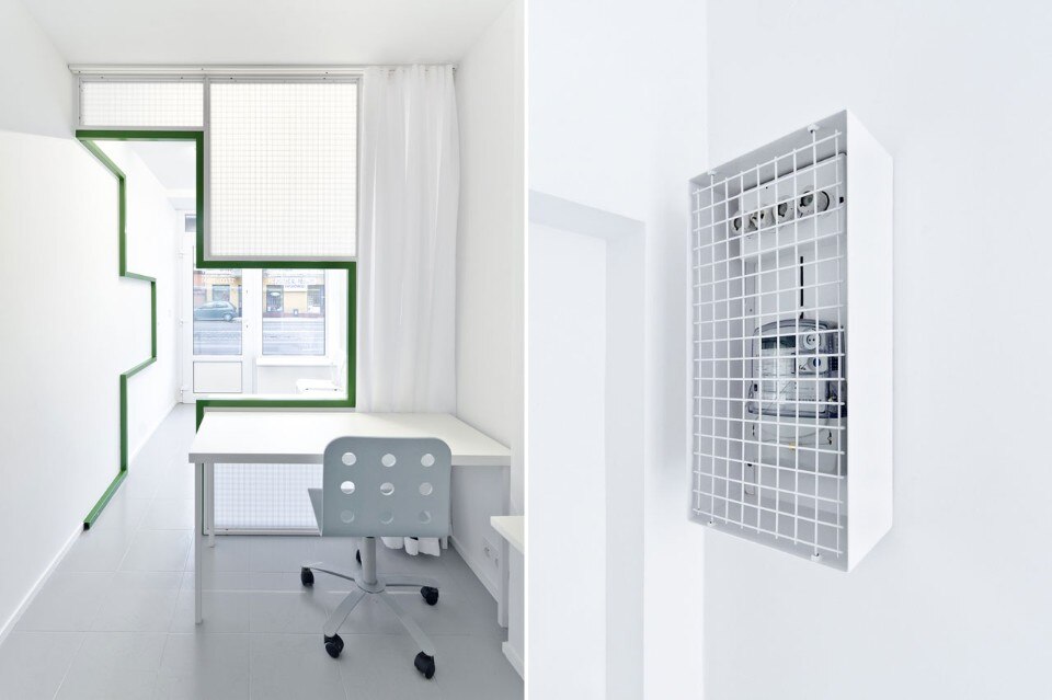 Per questo studio dentistico in Polonia Adam Wiercinski ha diviso una piccola stanza in due zone separate attraverso una griglia in acciaio sagomata dal profilo di una croce verde.