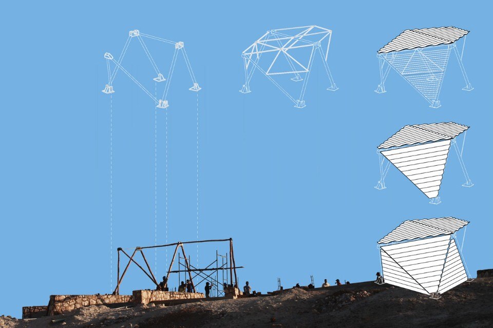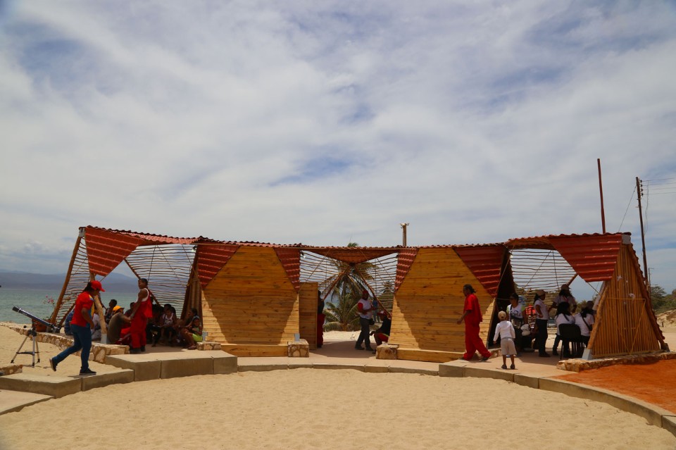 Le opere sono state cementate su una serie di setti in pietra locale, che servono a modulare e articolare lo spazio, e utilizza nodi metallici per collegare la struttura portante, risolta con una triangolazione di barre di legno e acciaio. Le coperture in legno e plastica riparano dal sole e della pioggia pur lasciando gli spazi aperti e continui.