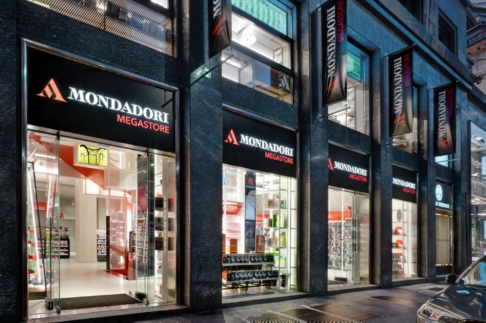 Elementi flessibili di allestimento, caratterizzati dalla leggera trasparenza delle lamiere forate e da un sistema articolato di grafica segnaletica, si offrono a supporto dei percorsi di ricerca ed esplorazione, mentre sullo sfondo scorre il racconto per segni e immagini della storia di Mondadori.