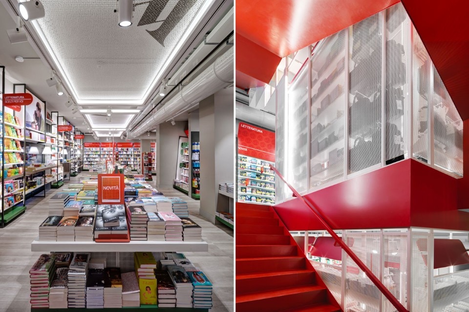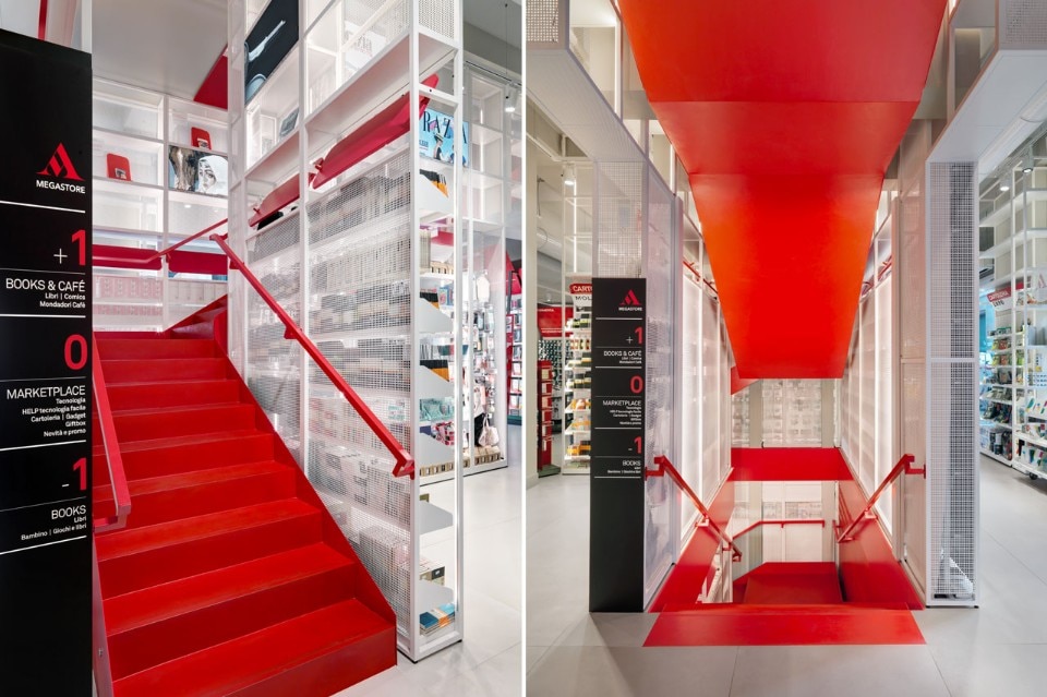 Il rosso aziendale, che segna la scala e tutta la comunicazione grafica, incontra il verde e il bianco dei metalli che disegnano gli espositori inclinati, in appoggio alle pareti.