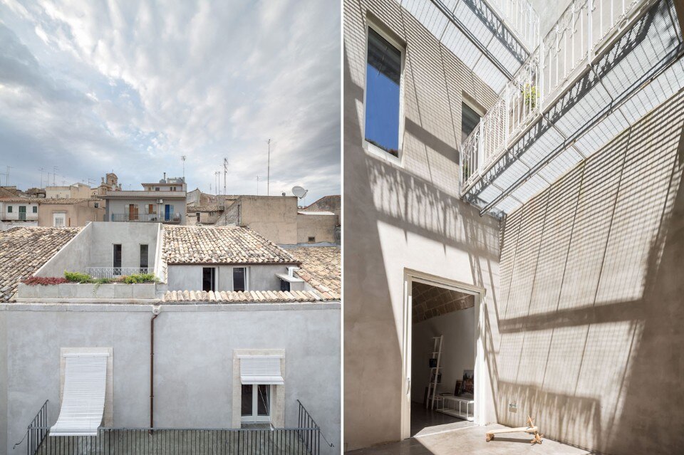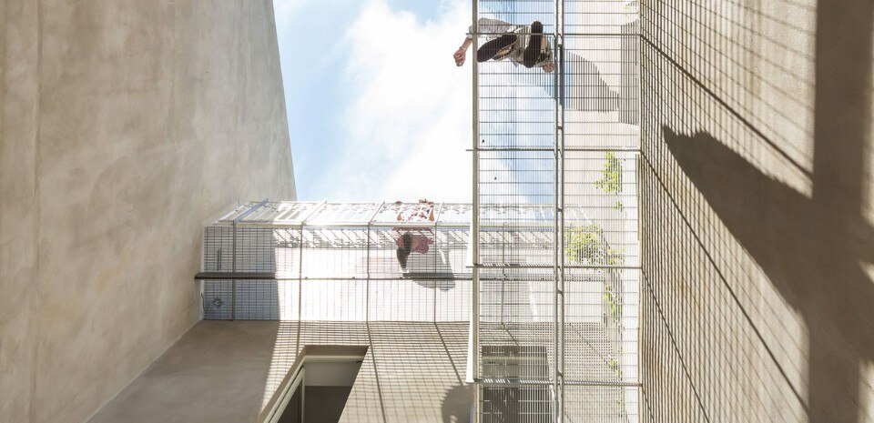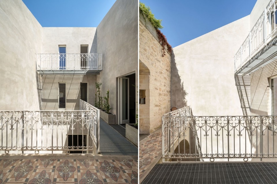 La corte, che diviene il nuovo ingresso dell’abitazione, coniuga conservazione e innovazione: la tipologia della corte è un’importazione da consolidate tradizioni costruttive, mentre le passerelle in grigliato metallico con ringhiere di recupero in stile liberty contrastano con il peso della muratura piena.