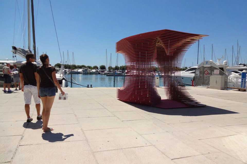 Le geometrie dei pannelli in MDF di cui è composto, reinterpretano il panorama architettonico e il paesaggio della città, ispirandosi sia alle forme degli edifici dell’architetto Jean Balladur che alle linee morbide delle imbarcazioni ormeggiate al molo Paul Harris. Le forme fluttuanti del volume, modellate e scolpite dal vento come un erosione, possono essere attraversate dai visitatori i quali sono invitati a sedersi al suo interno per ripararsi dal sole e scoprirne la natura mutevole.
