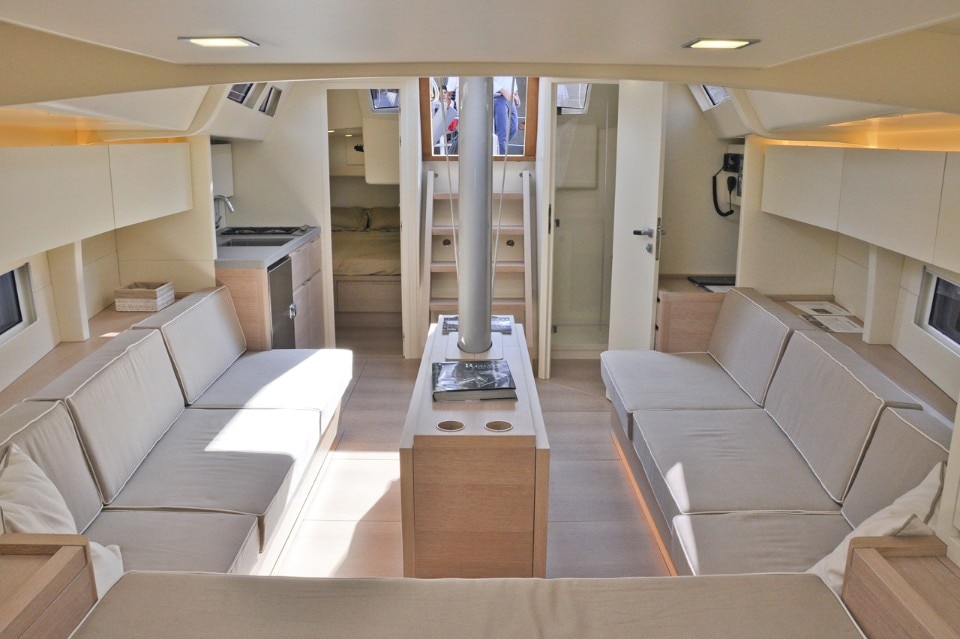 Sottocoperta vi è uno spazio aperto che offre tutti i comfort per la navigazione di giorno e per brevi crociere: due cabine doppie, un bagno, una cucina e un tavolo espandibile con due panche. La cabina di prua e il tavolo possono essere separati dalla cambusa da una parete leggera per creare una cabina armatoriale, luminosa e spaziosa. Mobili di alta qualità esprimono lo stile semplice e sportivo di Nauta Yachts, in linea con le forme orientate alle alte prestazioni dell’Advanced 44. Gli interni sono confortevoli, moderni e luminosi.