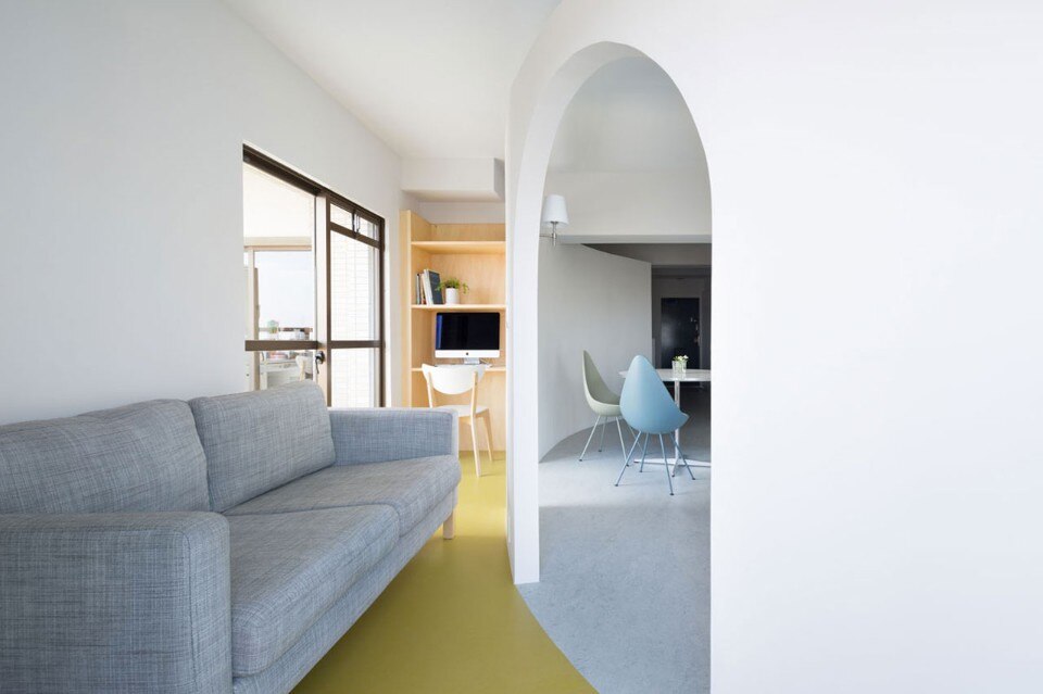 Il primo passo è stato quello di rimuovere la maggior parte delle partizioni esistenti, eccetto il bagno, per creare un unico grande spazio. Il successivo è stato quello di inserire tre pareti leggermente curve che si arrestano a 20 centimetri di distanza dal soffitto. Le pareti creano una varietà di spazi mantenedo la privacy di ogni membro della famiglia. Allo stesso tempo, le aperture sulle pareti collegano gli spazi e le persone. La separazione e la connessione non sono statiche.