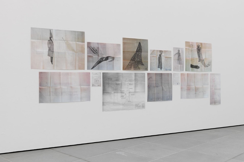 Aleksandra Chaushova, Annulment of the End of Things Costume I-VI (A Surgeon, The Body, The Mortician, The Lover, The Architect, The Official Speaker), 2015, Annulment of the End of Things Theater set I-VII (Sensors for the temperature and humidity, Hermetic box, Hermetic box handle, Plan of movement, Northern Façade, Cut through the Façade, Lifting Mechanism), 2015, Digitalprints. Photo Neues Museum (Annette Kradisch)