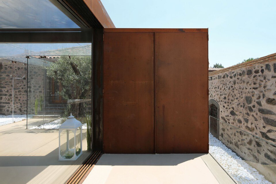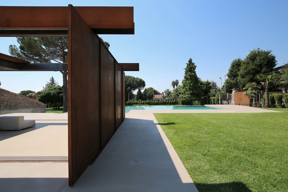 Interamente realizzata in corten, la veranda crea uno spazio dinamico, contemporaneamente coperto e aperto, riscaldato e ventilato, innovativo e tradizionale, statico e motorizzato, precario e stabile. La flessibilità è la vera anima di questo spazio che è totalmente modulabile e apribile in base alle esigenze e alle condizioni climatiche.