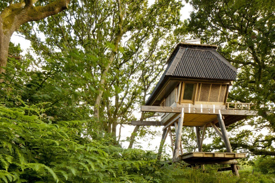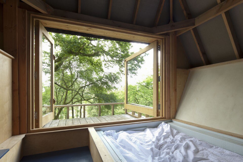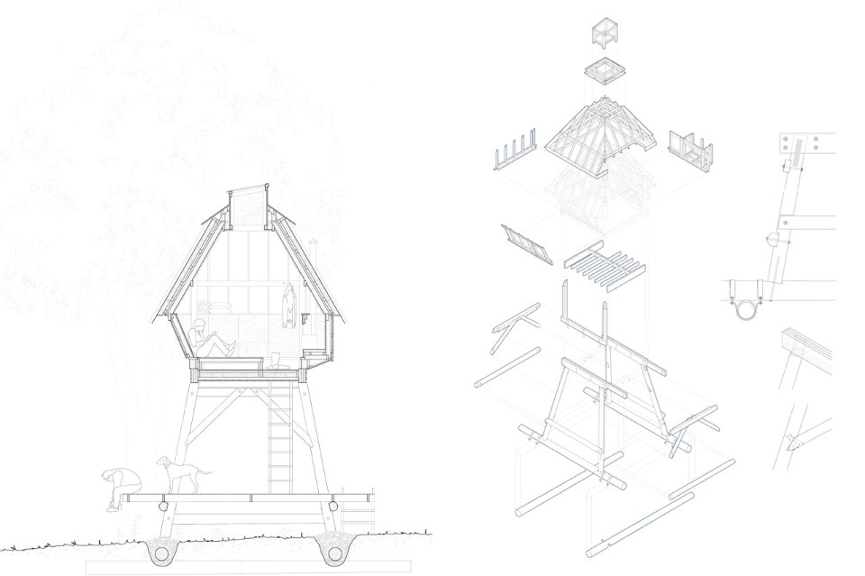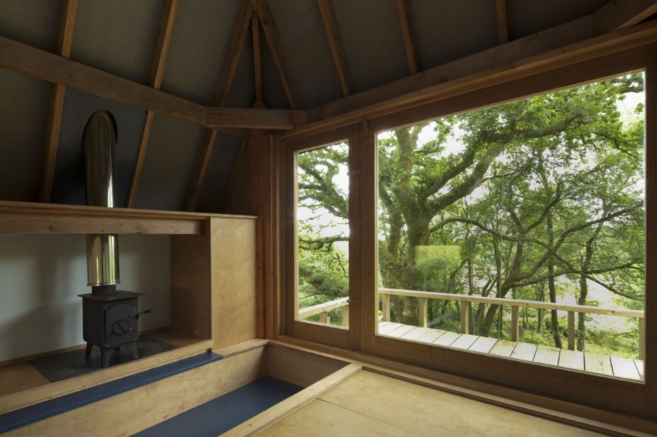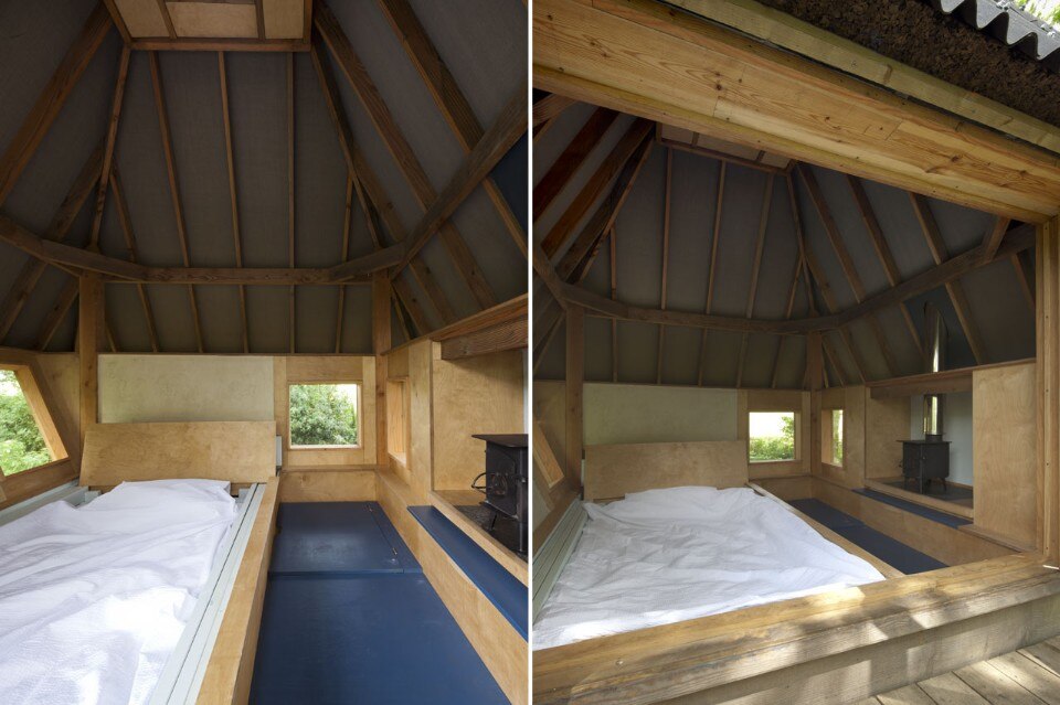 Per massimizzare l’area di soli 2,5x2,5 metri, il piano è diviso in due livelli, un ingresso con una nicchia con stufa a legna e un piano rialzato principale che ospita un letto sotto un pavimento di compensato rimovibile. La gronda del tetto rientra verso l’interno creando una sporgenza del soffitto in policarbonato e un piano di lavoro in compensato.